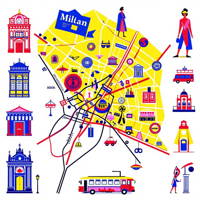 Tourist map of Milan in bold graphic style, bright contrasting colors, stylized icons of fashion boutiques, cafes, and tram lines, dynamic composition, energetic urban vibe, trendy modern artwork.