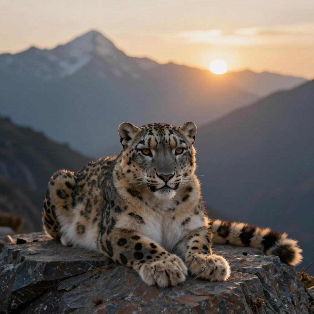 RAW Photo, DSLR close-up, snow leopard resting on rocky ledge, in Himalayan mountainous terrain, at golden hour dusk, chilly nature documentary film style, sunrays filtering through, cinematic lighting, professional color-graded.