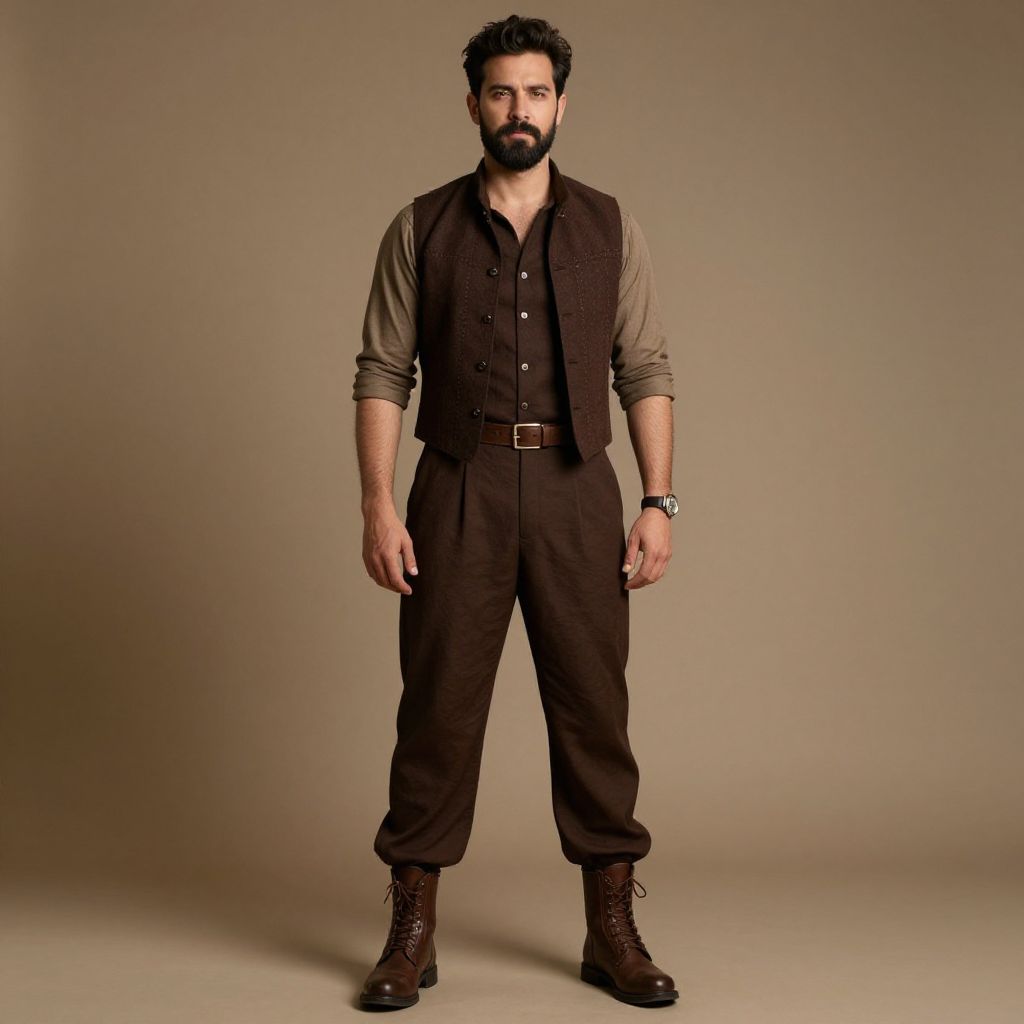 Man in brown outfit with a brown vest and brown boots. He has a beard and mustache and is looking at the camera.