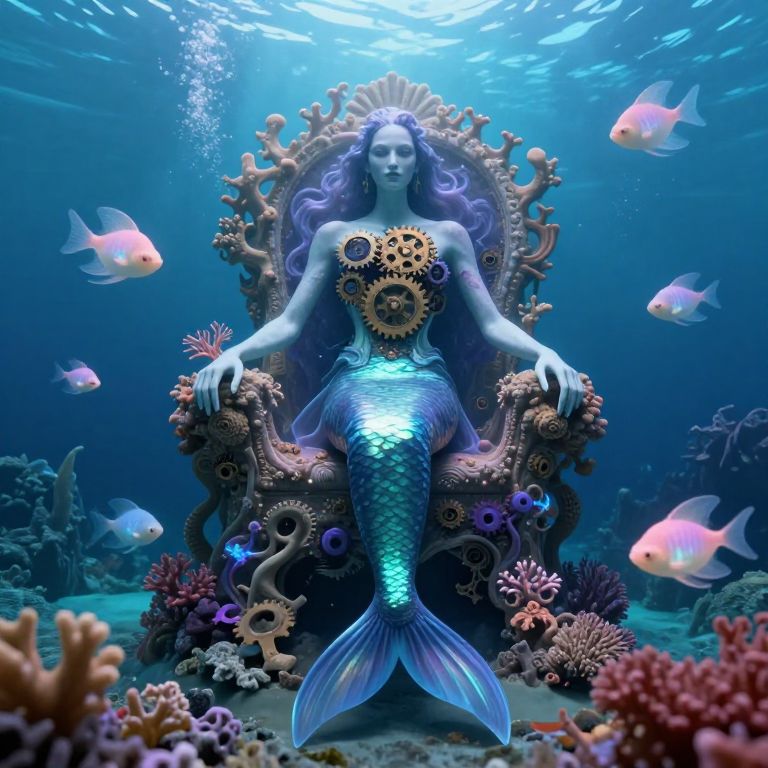 Digital artwork of a blue mermaid with flowing purple hair, seated on a throne made of gears, surrounded by colorful coral and glowing fish in an underwater
