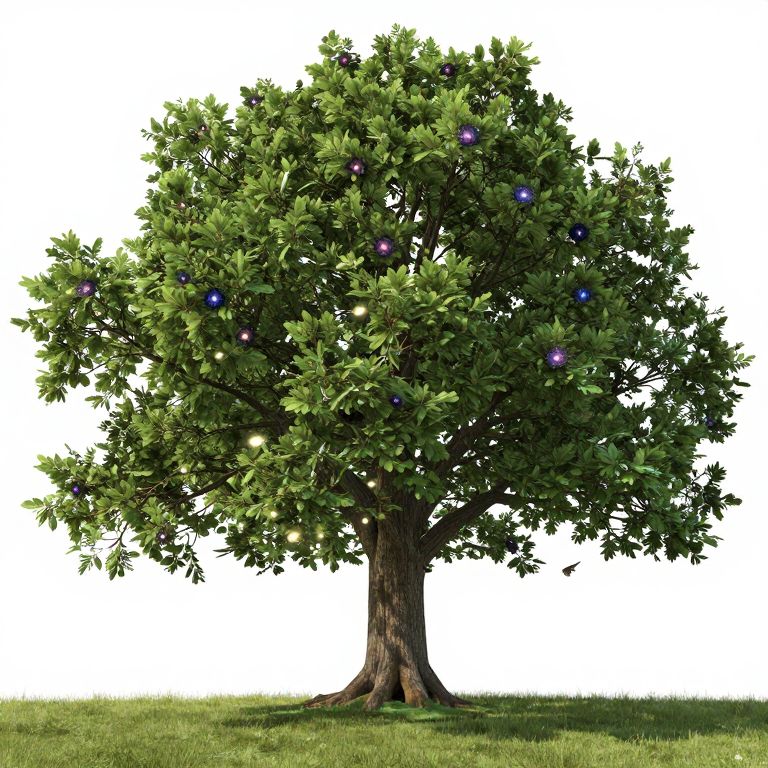 Photograph of a lush, green, leafy tree with a sturdy brown trunk, positioned slightly left of center. To the right, a shiny, silver metal watering can with a long spout and handle rests on a white background. The tree's dense foliage has a vibrant green color with small, pointed leaves, while the watering can's surface reflects light, emphasizing its metallic texture. The composition contrasts the natural tree with the man-made watering can, highlighting gardening elements.