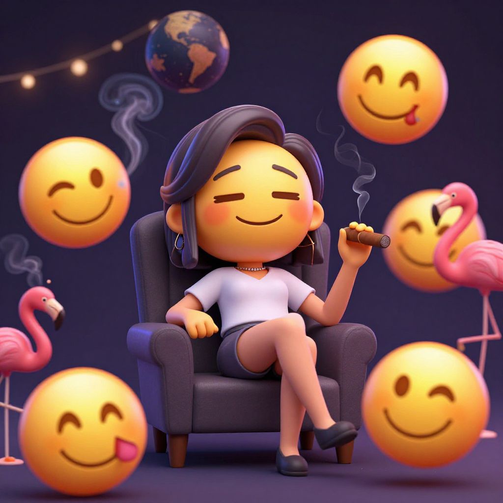 Kawaii Emoji Woman Relaxing with Flamingos and Cigars