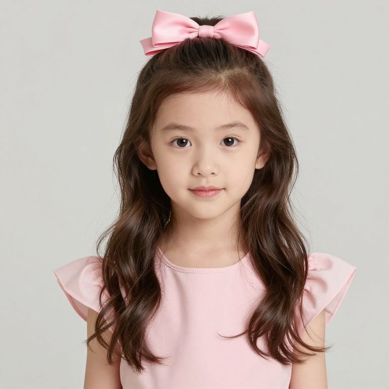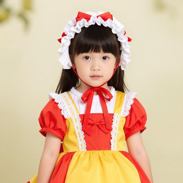 A young girl with brown hair is wearing a red dress with a white collar and a red bow. She is also wearing a black hat with a red flower on the side.