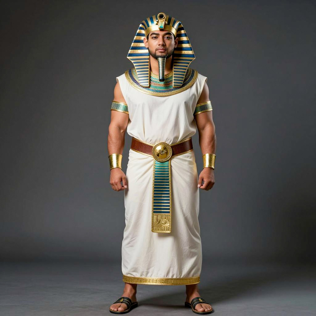Photorealistic full body portrait of a muscular man wearing traditional ancient Egyptian king attire. The man has a beard and serious expression, dressed in a white tunic with gold trim, black sandals, and a brown belt with a large circular buckle. He wears a blue and gold striped Nemes headcloth and matching arm and wrist cuffs against a dark studio background with professional lighting.