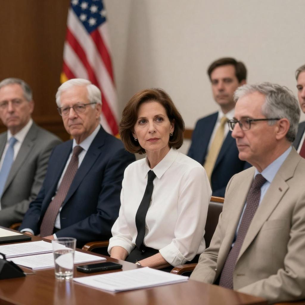 Photograph of a woman with light brown hair, wearing a green patterned blouse and red vest, standing in front of a whiteboard with red handwritten . She stands behind a wooden podium, with an American flag on the left and framed documents on the wall. She gestures with her right hand.
