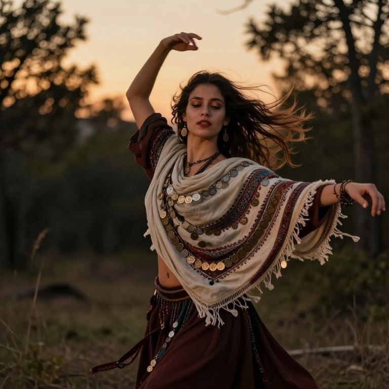 A romantic, atmospheric photo of a gypsy dancer with layered bohemian scarves threaded with antique coins, her face delicate and expressive with a hint of mystery, dancing in a quiet forest clearing under a golden dusk sky with wind rustling the trees.