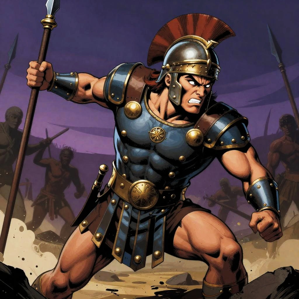 Illustration of Odysseus from the Trojan War depicted in a comic book style. The muscular hero wields a large spear and stands amid crashing waves on a stormy ocean shore. The scene uses cool shades of grey and teal with sharp, direct lighting emphasizing his fierce expression, muscles, and dynamic pose, conveying a sense of violence and action.