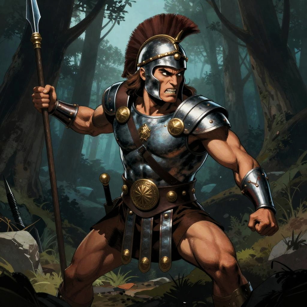 Kerning Odysseus from the Trojan War, illustrated in a comic book style, fighting on the stormy ocean shore with his spear, his face showing a fierce expression of anger and determination, with the colors leaning towards cool shades of grey and teal, creating a sense of violence and action, while the lighting is sharp and direct, highlighting the hero's muscles and form.