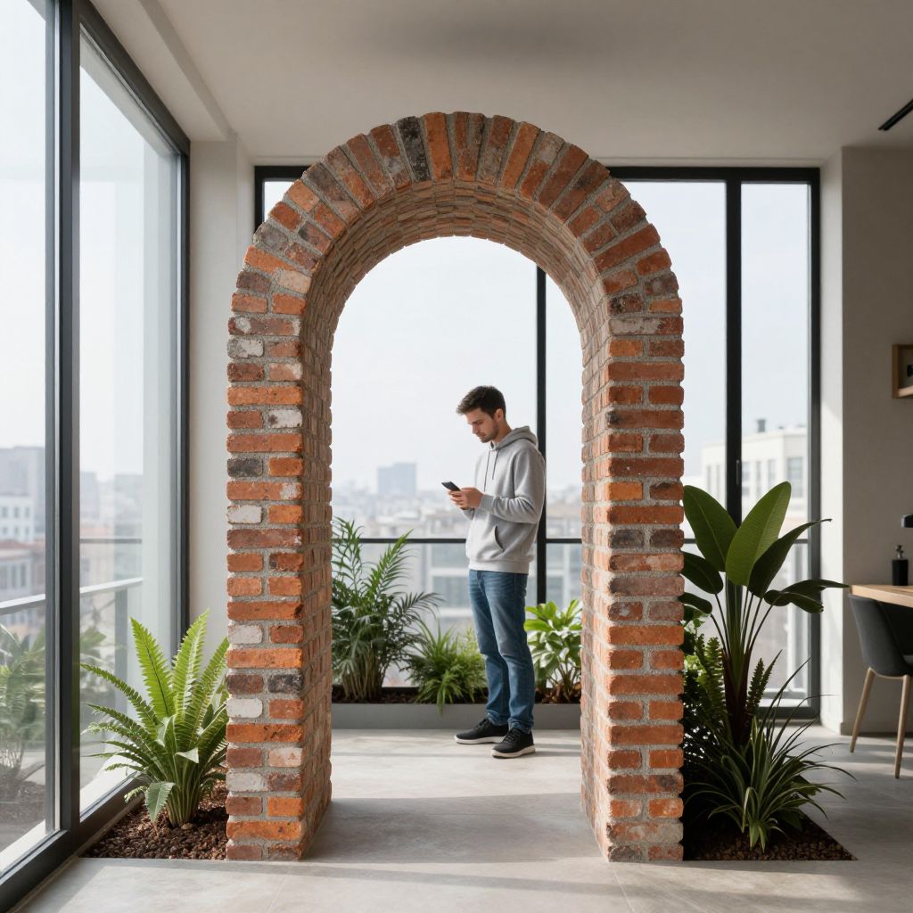 A modern brick archway made of reclaimed industrial bricks, placed between two large glass windows in a minimalist urban apartment. The archway spans a small patio area with green plants on either side. A young man in a gray hoodie and jeans stands behind the archway, looking at a smartphone, with sunlight streaming in from the large window behind him.