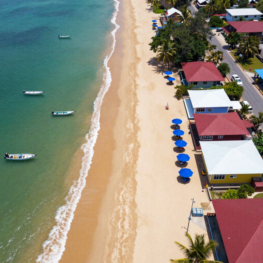 Aerial photo of a tropical beach with golden sand meeting clear, turquoise waters. Small boats are scattered near the shoreline. On the right, a row of colorful buildings with red and white roofs, surrounded by green trees and palm fronds. Blue umbrellas dot the sandy area, and a road runs parallel to the beach. The image is vibrant and sunny.