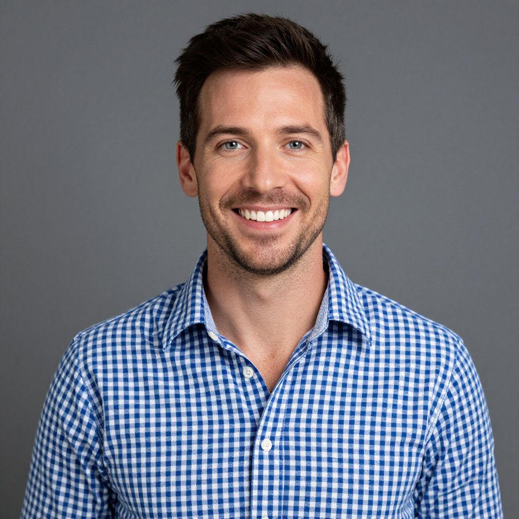 Photograph of a smiling, attractive man with short dark brown hair and light stubble. He's wearing a blue and white checkered button-up shirt with the top button undone. His skin is light, and he's standing against a plain gray background. His eyes are light blue, and he has a friendly, approachable demeanor. The lighting is even, highlighting his features clearly.