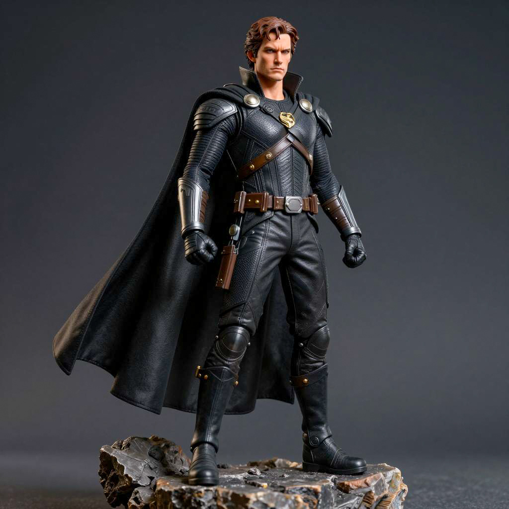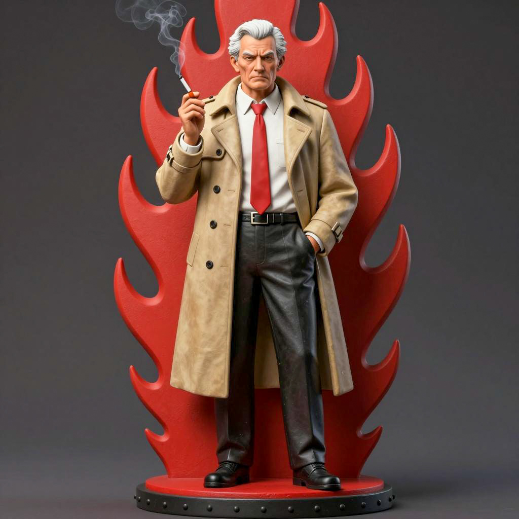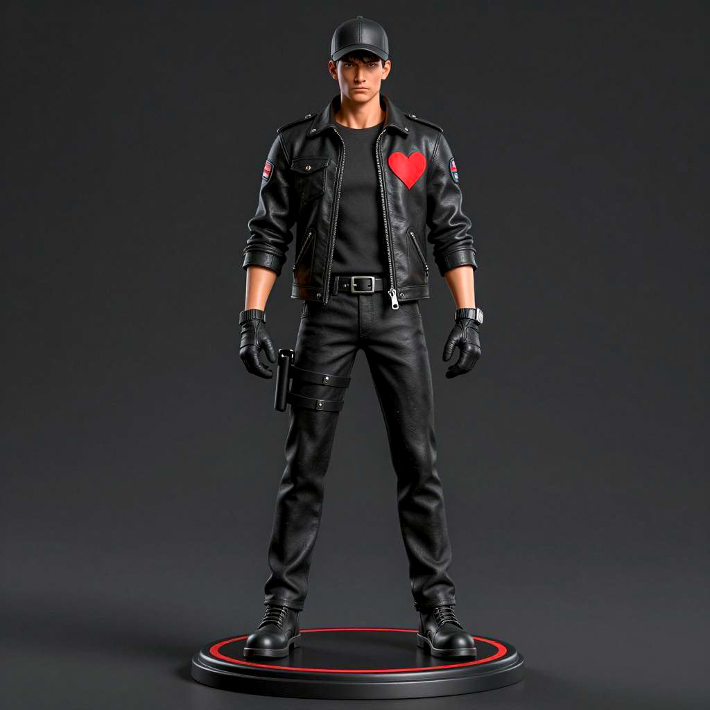 Male figure with short, brown hair, intense expression. Wearing brown leather jacket with shearling collar, black t-shirt, blue jeans, knee pads, black gloves. Holding black handgun in right hand. Left hand rests on thigh. Standing on circular base with metal piece at foot. Dark grey background. Stylish, realistic illustration. Standing, slightly angled to left. Number of people: 1. Clothing details: jacket pockets, belt with pouches. Pose: confident, ready.