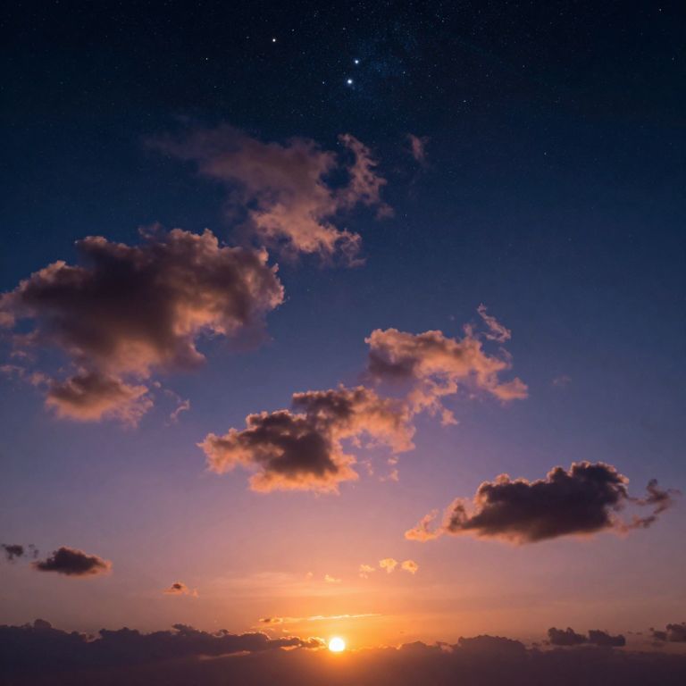 A celestial tapestry where clouds, infused with hues of twilight, seem to dance and reshape themselves, casting an otherworldly glow over a horizon where sun and stars coexist in eternal harmony.