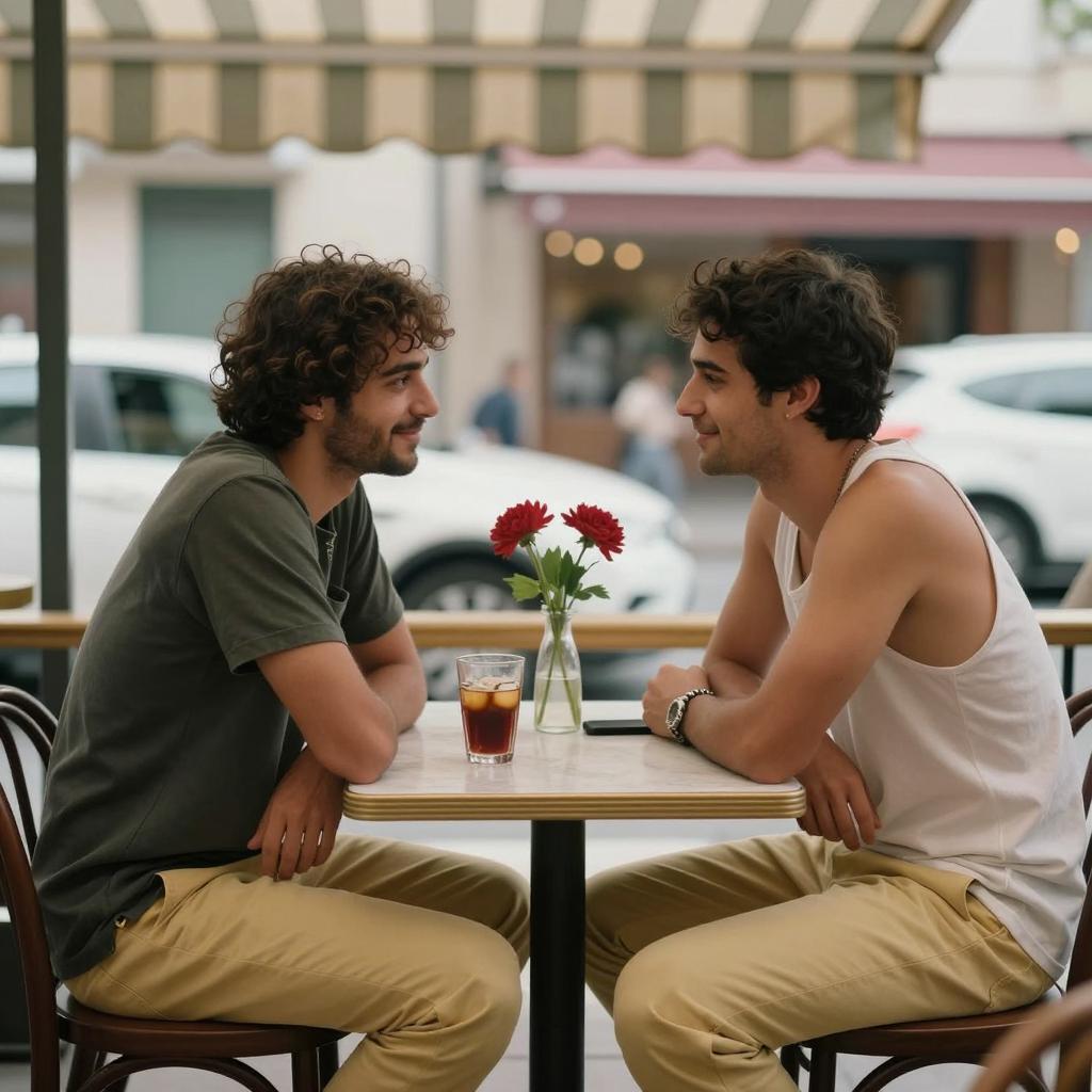 Two men sit at a café table. The man on the left wears a dark green shirt and light yellow pants, with curly hair. The man on the right wears a white tank top and light yellow pants, with short dark hair. They face each other, smiling. A vase with red flowers is on the table. A yellow and green striped awning and a street with a white car are in the background.
