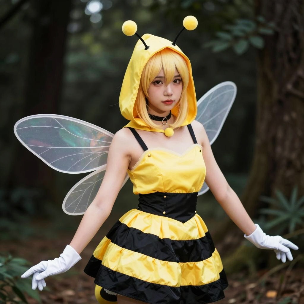 A young woman wearing a detailed Charmy Bee cosplay costume posing outdoors in a dark forest background. The outfit includes a yellow and black striped dress, translucent bee wings, white gloves, and a yellow hood with antennae featuring yellow pom-poms. The character-inspired costume is carefully designed to capture the look of Charmy Bee.