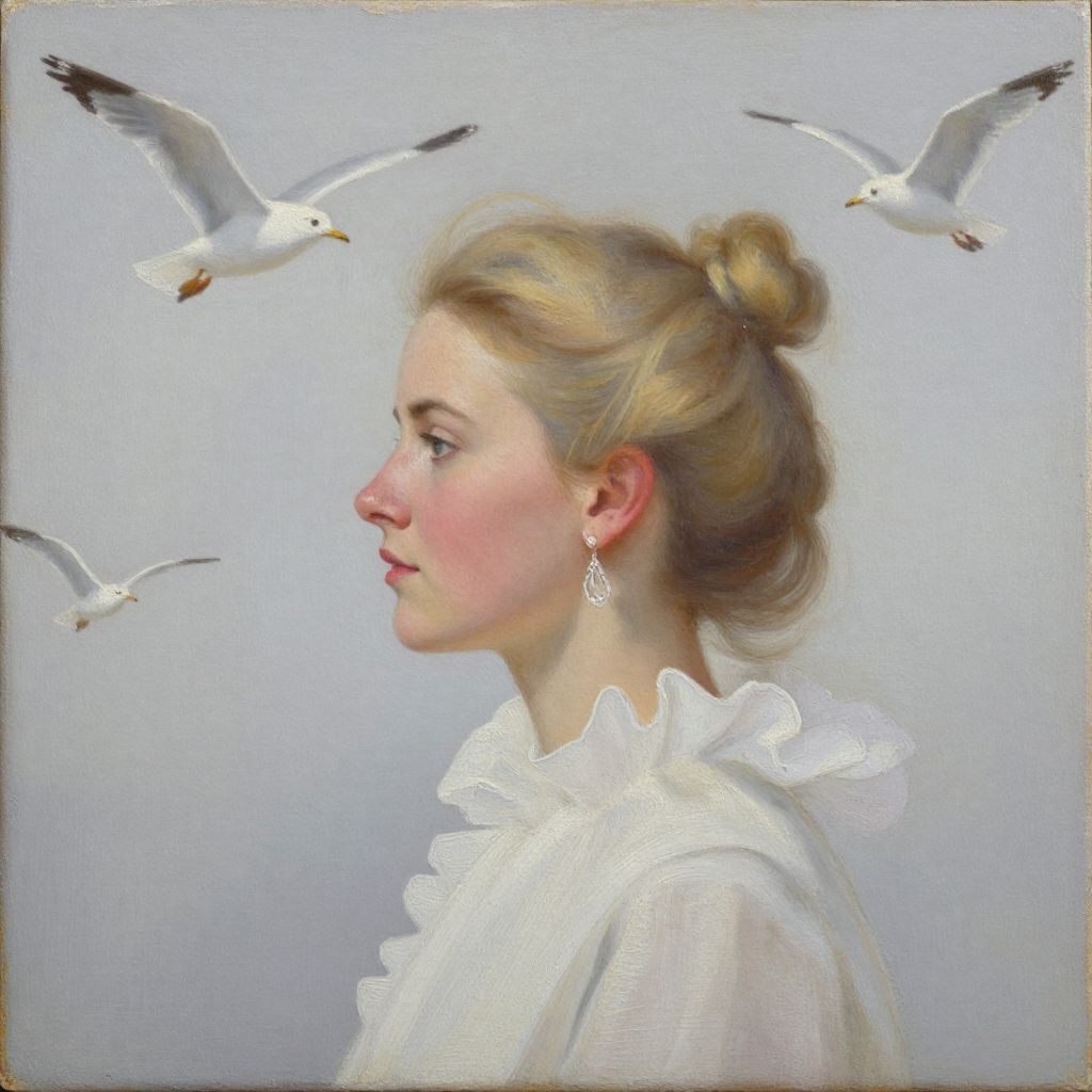 A serene portrait painted in oil on canvas by Clae Eastgate, featuring a woman with blonde hair styled in buns, adorned with delicate earrings and a white ruffled collar, set against a soft gray background with playful seagulls in flight, capturing a moment of gentle air and light.
