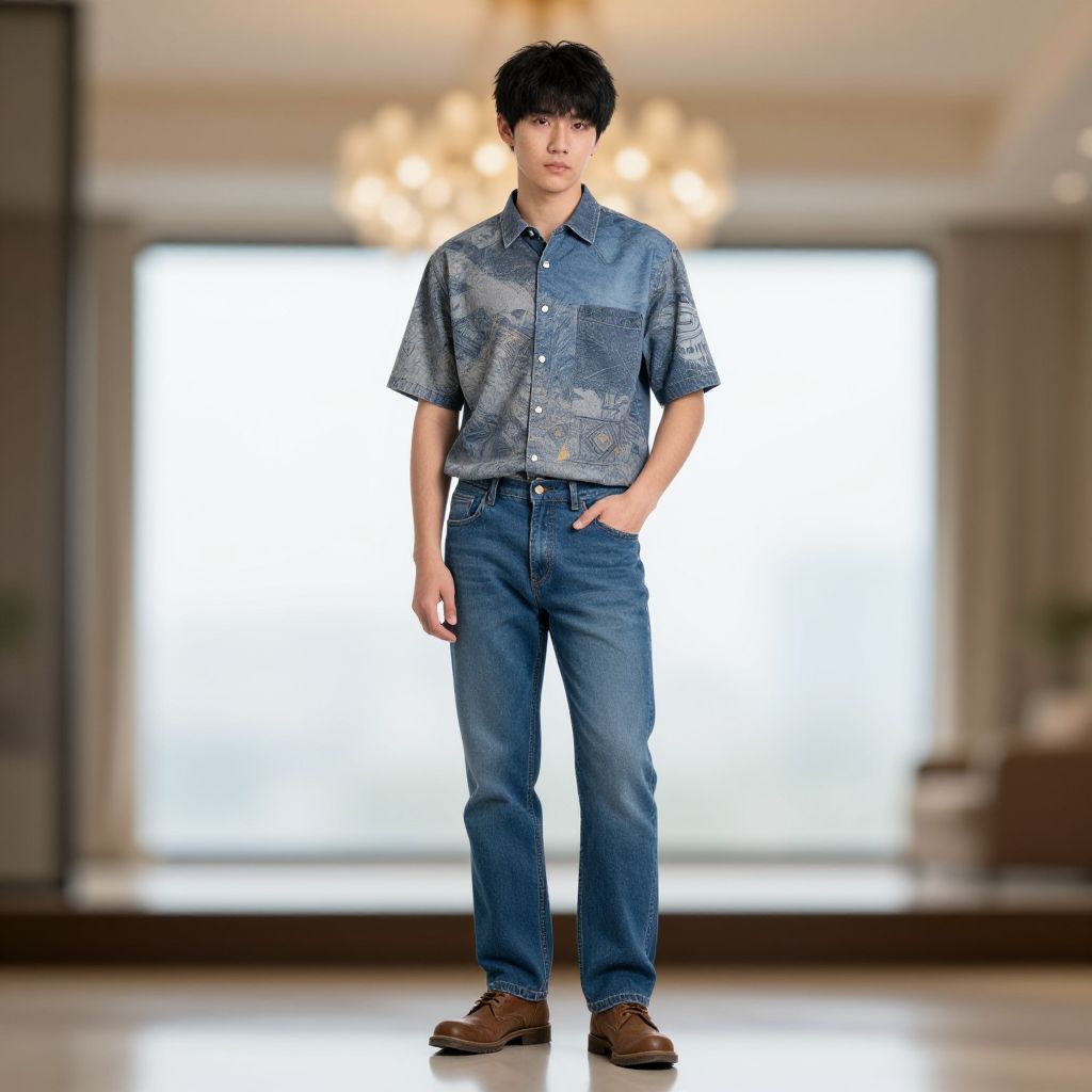 Photograph of an Asian man with short, black, slightly messy hair, standing in a brightly lit room with a blurred chandelier and large window in the background. He wears a short-sleeved, blue, button-up shirt with a subtle pattern, blue jeans, and brown shoes. His hands are relaxed, with one hand in his pocket. The room has beige walls and a dark brown floor, with minimal furniture visible in the background. The lighting creates a soft, warm ambiance, highlighting his casual, yet stylish appearance.