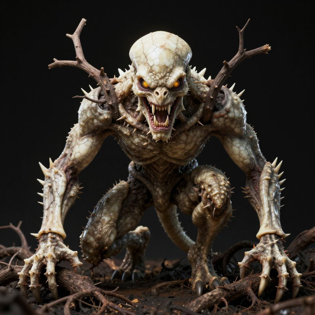 Full body, solo, cyclopean beast with cracked ivory skin and thorn-covered hands, branches reaching out, teeth baring, looking at viewer, crouched low beside deadened roots under wan light, predatory focus sharpening instincts for the hunt, black background
