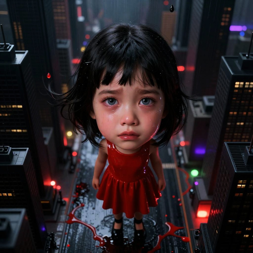 Close-up high perspective of a little girl with black hair and blue eyes wearing a shiny red liquid-like dress and black shoes, standing on a city street surrounded by towering black oil skyscrapers. The girl is crying with visible tears on her cheeks. The scene features dark noir and psychedelic elements with giant black oil monsters attacking the city, red oil rain, and splashes creating a surreal, hyper-realistic atmosphere with vibrant lighting and reflections.