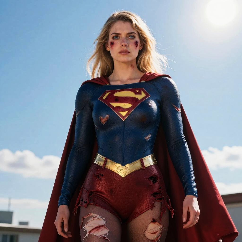 8k, best quality, real picture, intricate details, ultra-detailed, ultra highres, depth field, (photorealistic, realistic:1.2), masterpiece, photo of european girl, supergirl, (bruise, dirty, torn clothes, revealing clothes, blood:1.3), blue eyes, blonde hair, long hair, ripped cape, ripped pantyhose, superhero, solo, sun, blue sky, realistic, photorealistic, (intricate details:1.2), (delicate detailed), (cinematic light), clear line, sharp focus, realistic face, detailed face, unity 8k wallpaper, ultra high res, (photorealistic:1.4)