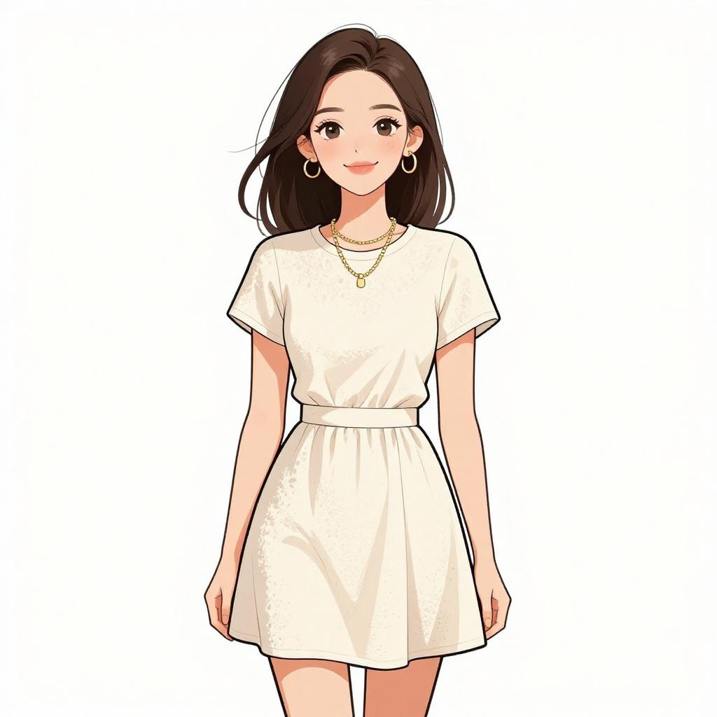 Woman with pretty face and pretty hair. smiling Woman, modern casual, sheer white grid-patterned t-shirt, short sleeves, black trim on collar, solid black high-waisted A-line skirt, above knee length, solid white background --sref 1467