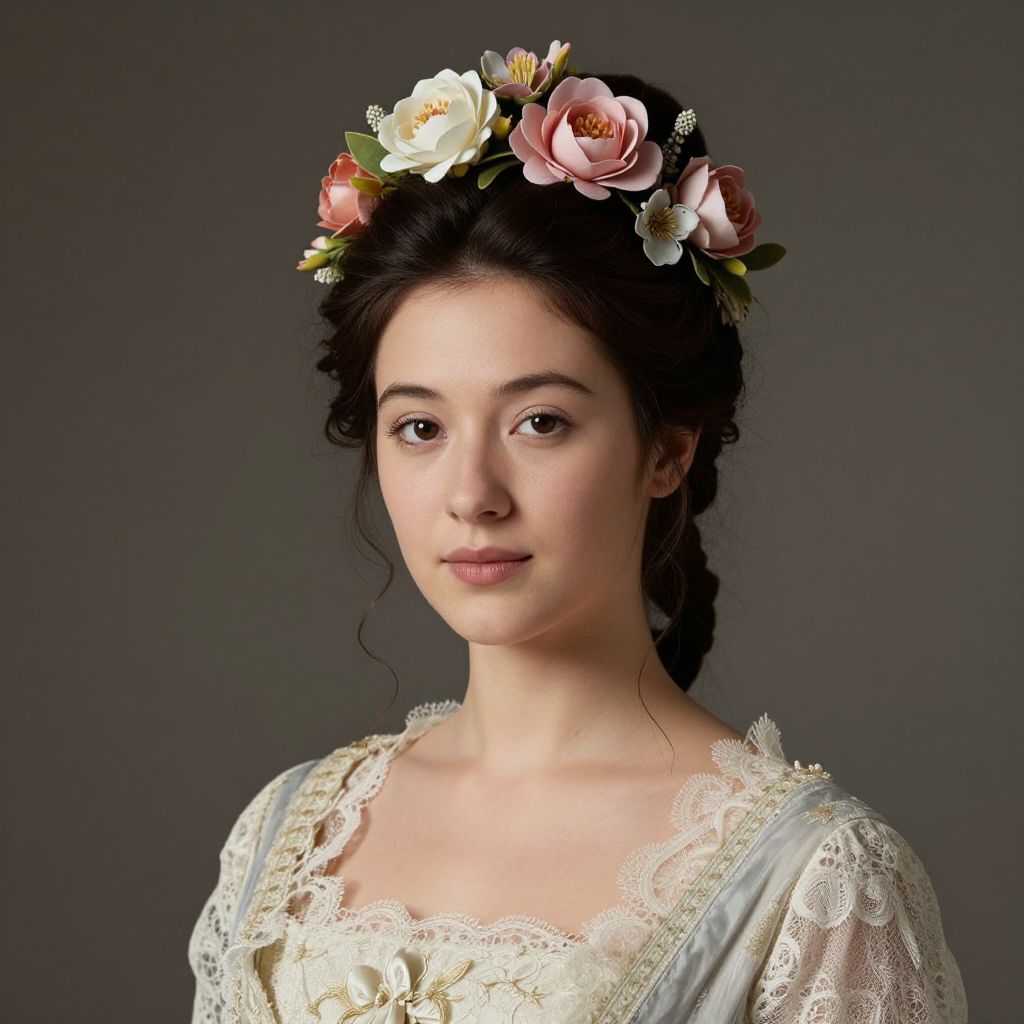 Elegant portrait of a woman adorned with a floral headpiece and delicate lace attire, capturing the refined beauty and sophistication characteristic of Napoleonic-era fashion.