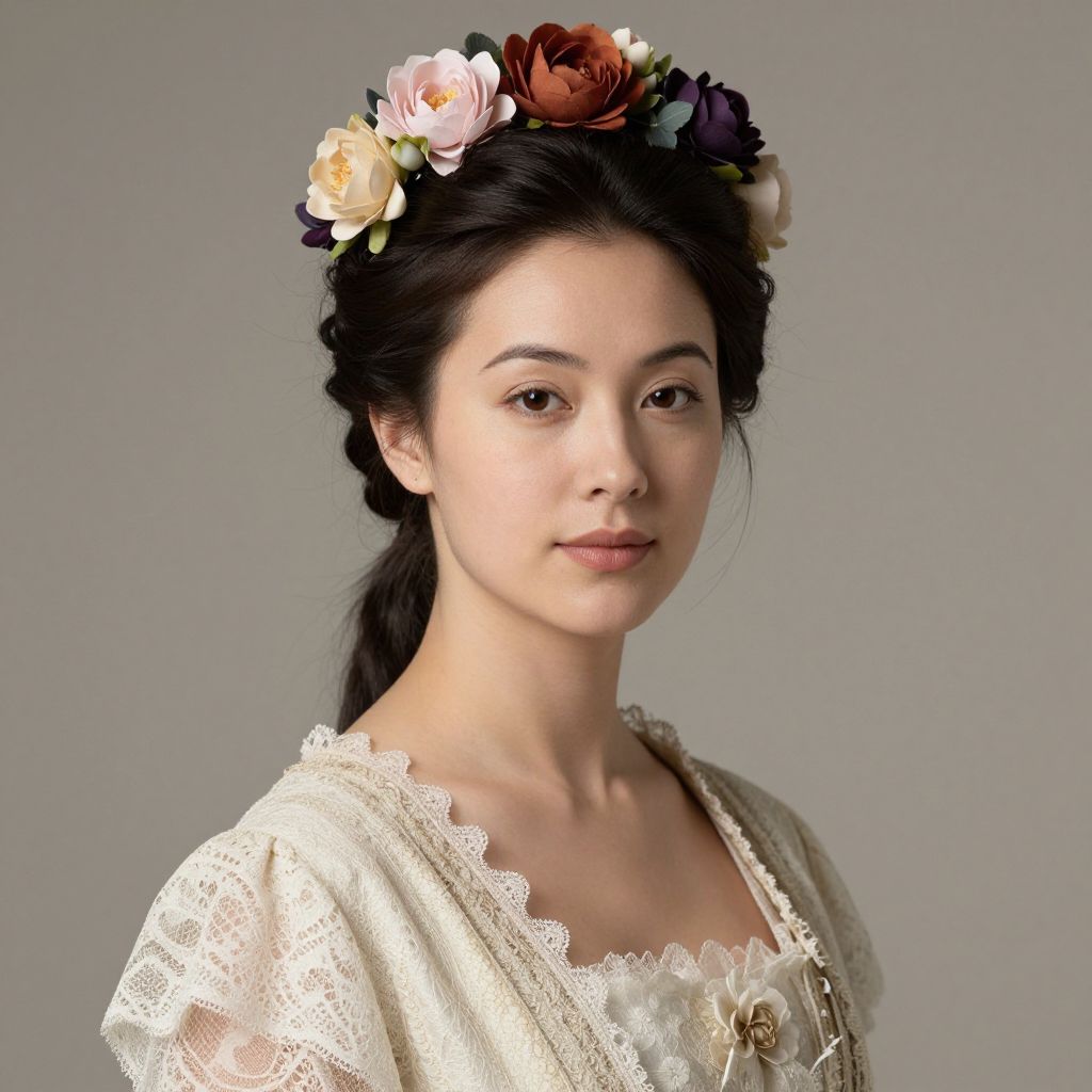 Photograph of an East Asian woman with fair skin and dark hair styled in a loose braid. She wears a floral crown with pink, orange, and purple flowers, and a white lace-trimmed dress with a square neckline and small buttons. Her expression is neutral, and she gazes directly at the camera. The background is a plain, light gray, putting focus on her. The lighting is soft, highlighting her delicate features and the textures of her lace dress and floral crown.