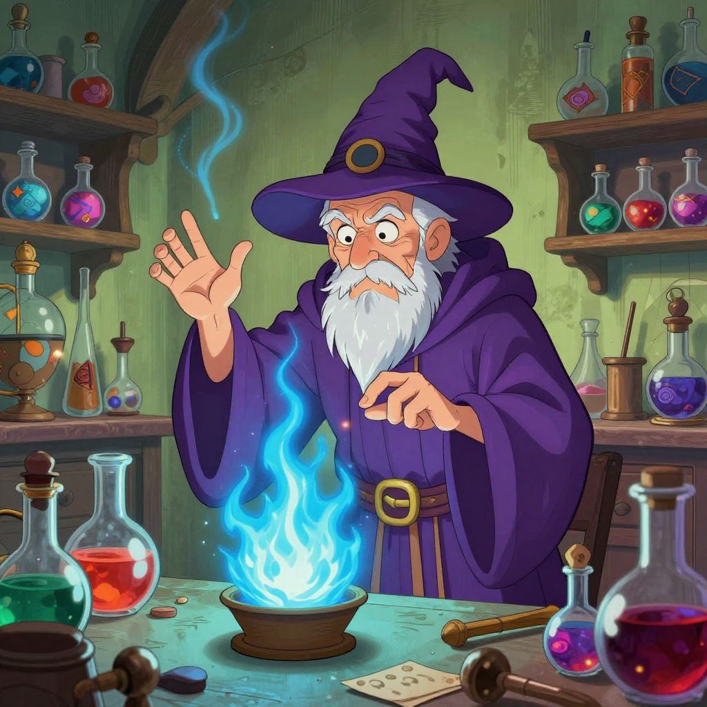 Cartoon wizard with white beard, purple robe, and hat, conjuring blue flames over a cauldron in a colorful, cluttered alchemy