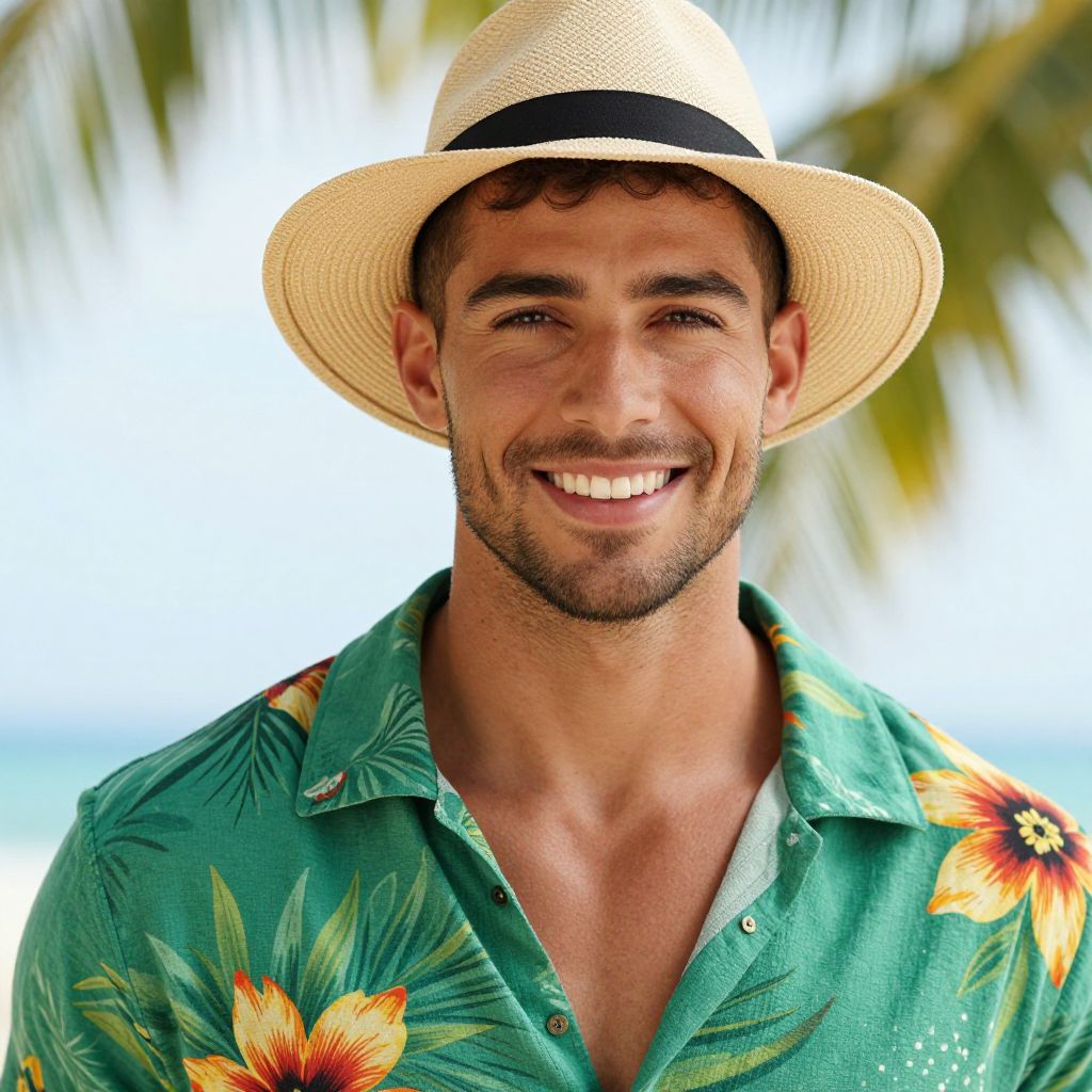 A handsome man in his late 20s, with a warm smile and a tan complexion, wearing a vibrant green floral shirt and a stylish straw hat on his head. The image should have a bright, tropical, and sunny aesthetic.