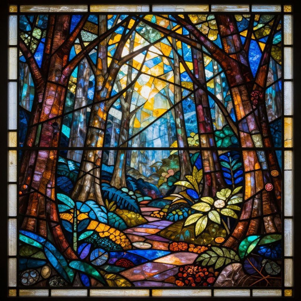 Stained glass art style depicting a vibrant mystical forest scene, intricate geometric patterns, radiant sunlight filtering through colorful glass shards, rich jewel tones, high contrast, elegant lead outlines, vintage cathedral window inspiration, atmospheric and luminous