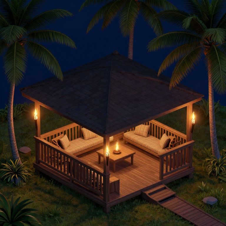 Unbeatable isometric view of a comfortable lanai in Hawaii at night, torches, sitting area, wood, detail, palm trees,