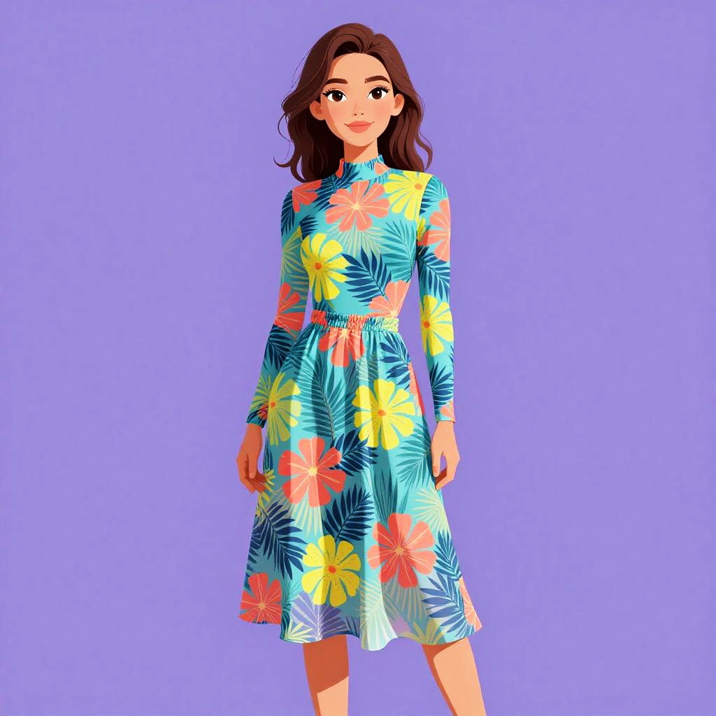 Illustration of a woman with long brown hair wearing a long sleeve swimsuit with a vibrant tropical floral print in teal, coral, and yellow colors. The swimsuit features a high neckline and is paired with a matching flowy chiffon skirt with an elastic waistband, knee-length. The fabric appears lightweight and breathable, suitable for warm weather.