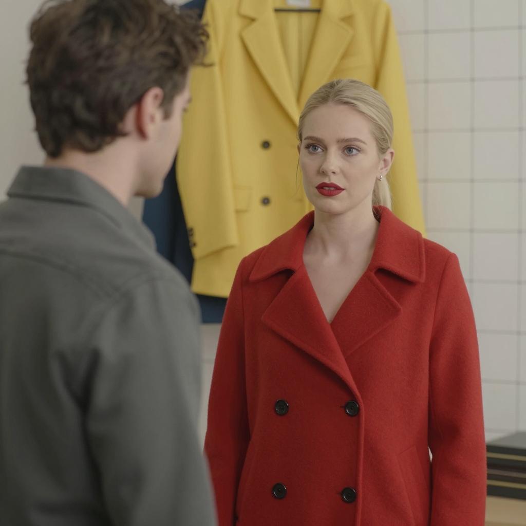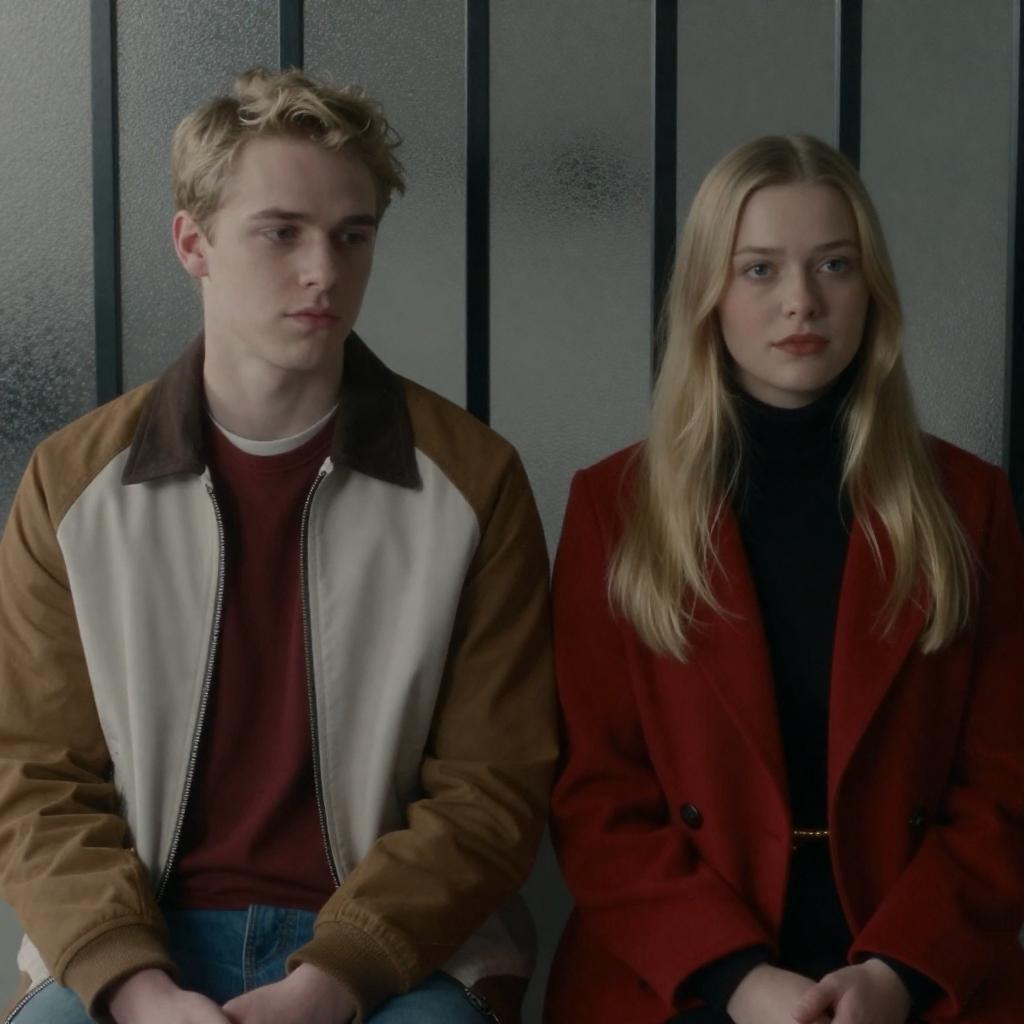 Photograph of a young man and woman sitting side by side against a frosted glass background with black vertical bars. The man has short, blonde hair, fair skin, and wears a brown and white jacket over a red shirt. The woman has long, blonde hair, fair skin, and wears a red coat over a black turtleneck. Both have neutral expressions, looking slightly to the left. The man is looking down, while the woman gazes forward. The lighting is dim, casting soft shadows.