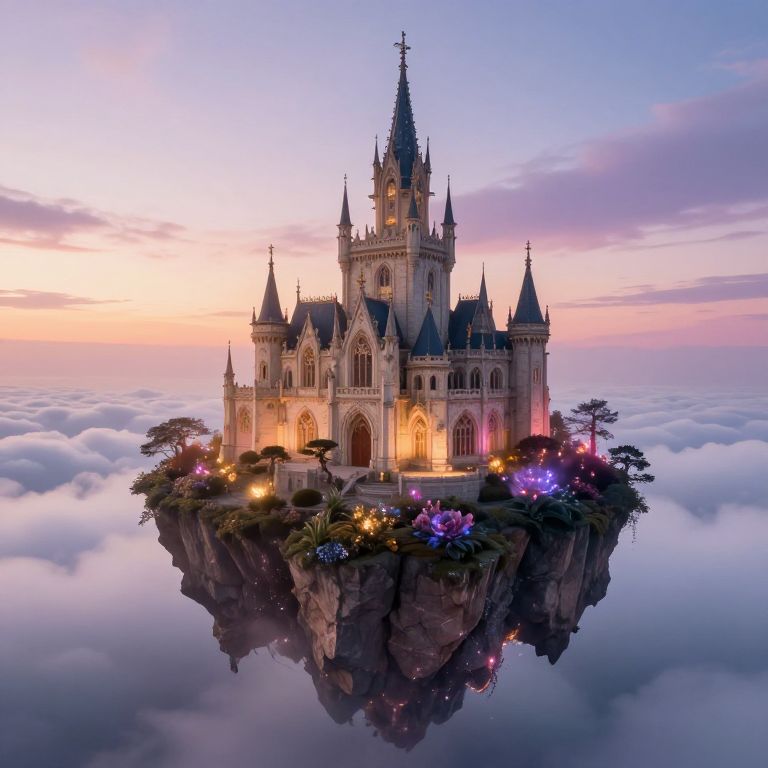 Fantasy mansion nestled on a floating island above the clouds, surrounded by glowing magical flora, with towering spires and intricate gothic architecture, illuminated by radiant twilight, evoking a mystical and enchanting atmosphere.