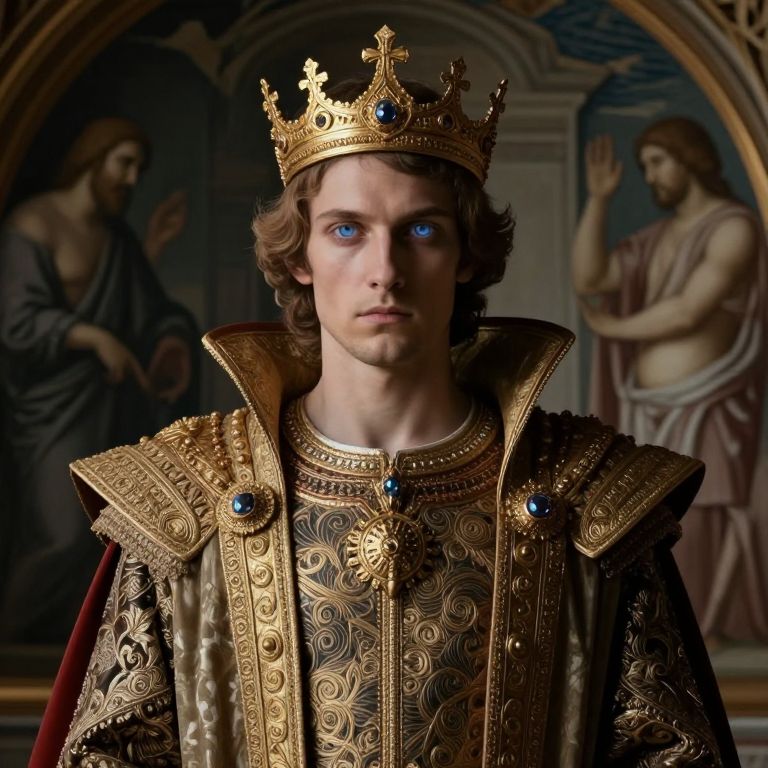 A digital artwork depicting a young man with fair skin and blue eyes, wearing an elaborate golden crown adorned with blue gems. He has shoulder-length, wavy brown hair and is dressed in an ornate, gold-embroidered royal robe with matching blue gemstones. The background features a dimly lit, classical-style room with two painted religious figures; one is a bearded man in dark robes on the left, and the other is a nude, bearded man with a raised hand on the right. The overall style is realistic with a slightly medieval or Renaissance aesthetic.