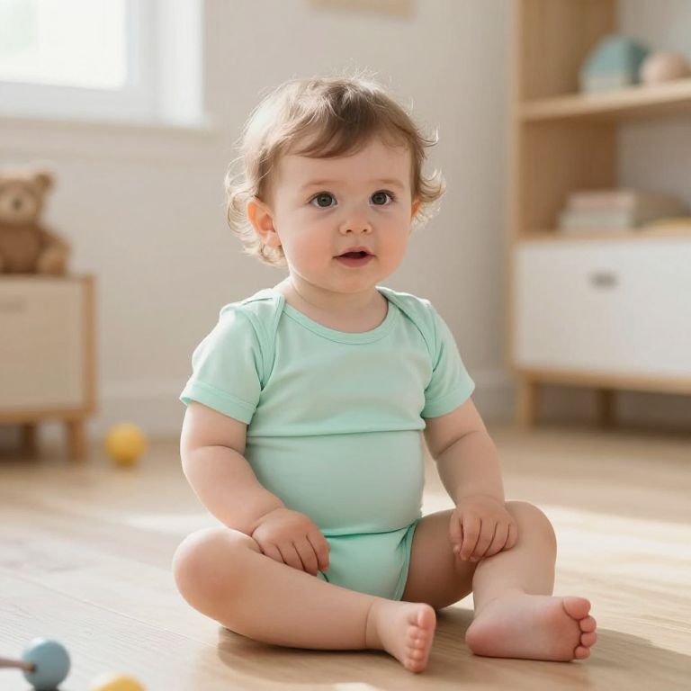 Photograph of a cute, light-skinned toddler with curly brown hair, wearing a light mint-green onesie, sitting on a wooden floor in a