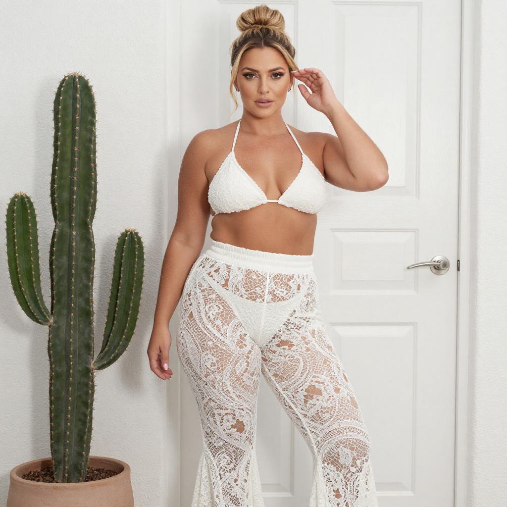 Photograph of a curvy woman with light brown skin and blonde hair in a bun, wearing a white lace bikini top and high-waisted, white lace bell-bottom pants. She stands in front of a white door with a potted cactus to her left. Her right hand touches her hair, and she gazes at the camera with a neutral expression.