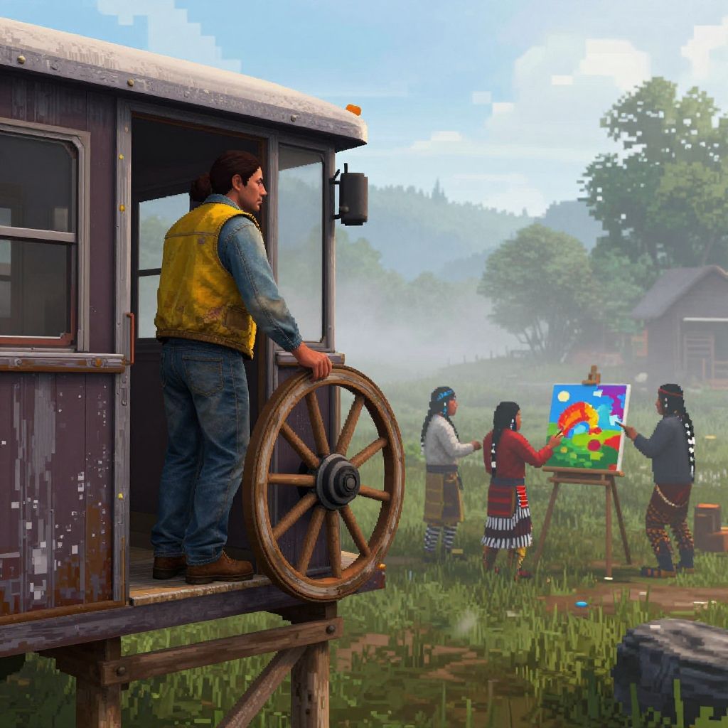 Racing video game style, detailed car models, realistic environments, motion blur in this pixelated artwork, we find ourselves standing on the rickety stilts of a weathered stilt house, overlooking a misty morning landscape. a 42 year old streetcar operator, dressed in worn denim and a faded yellow vest, gazes out into the distance with a look of quiet contemplation. her eyes are cast downward, as if lost in thought, but her hands still hold onto the worn wooden wheel of her cart. the atmosphere is one of efface, the misty air blending seamlessly with the pixelated style to create an ethereal quality. the colors are muted, with shades of blue and green dominating the scene, punctuated by splashes of warm sunlight filtering through the mist. in the distance, a group of native american artists can be seen gathered around a makeshift easel, their brushes dancing across the canvas as they work on their latest masterpiece. the renaissance inspired artwork on display is vibrant and bold, a stark contrast to the subdued colors of the surrounding landscape. as we gaze upon this scene, we are transported to a world where creativity knows no bounds, where art and nature blend seamlessly together in perfect harmony.