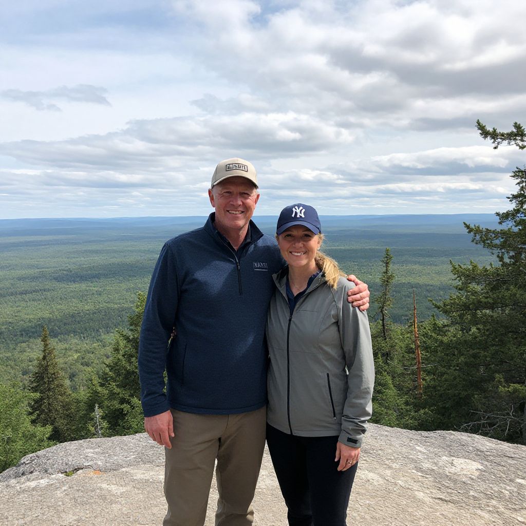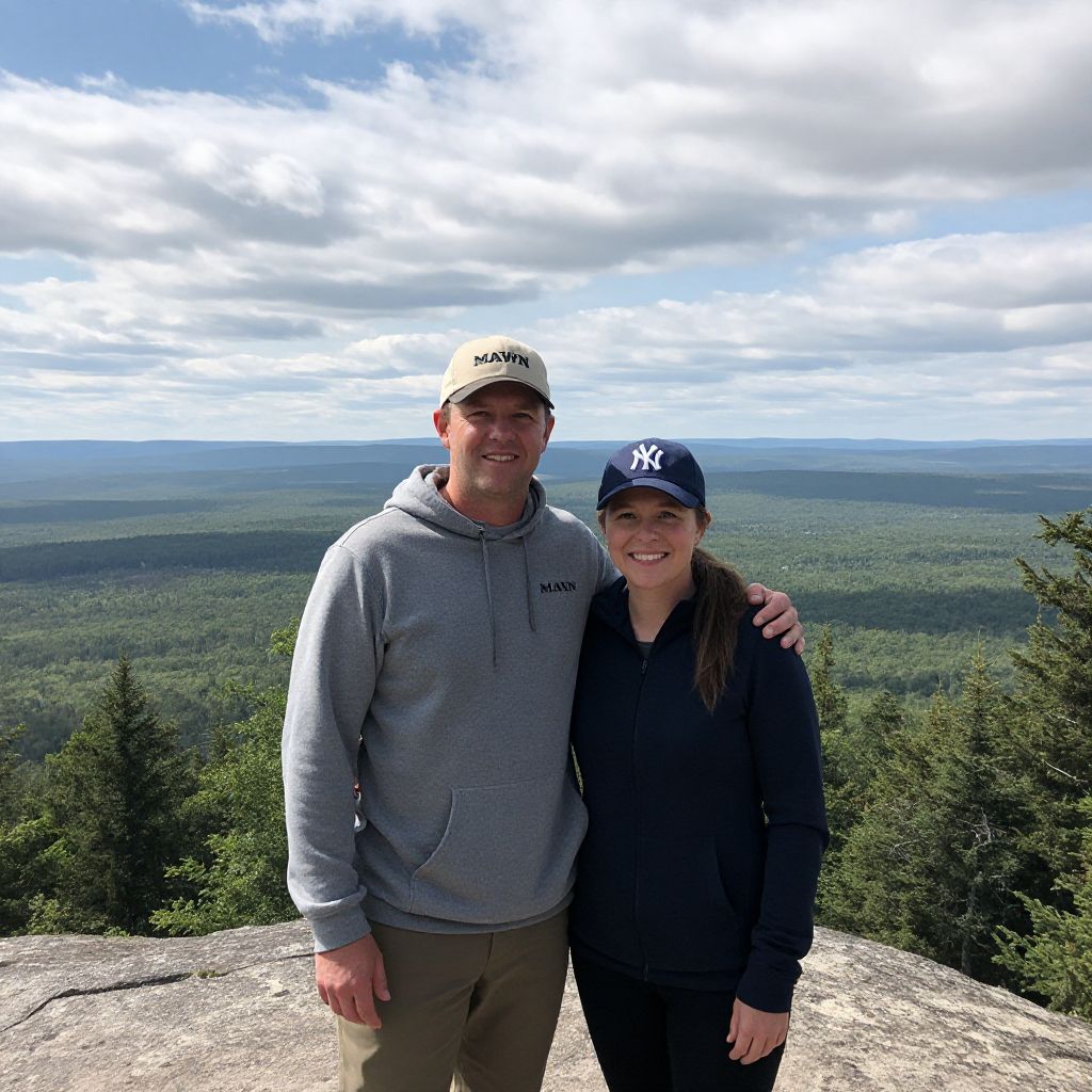 Two individuals, a man wearing a beige cap labeled \"MAWN\" and a woman sporting a dark blue \"NY\" cap, stand together atop a scenic overlook in Wild Mountain, Minnesota, with a vast forested landscape stretching out beneath a partly cloudy sky.