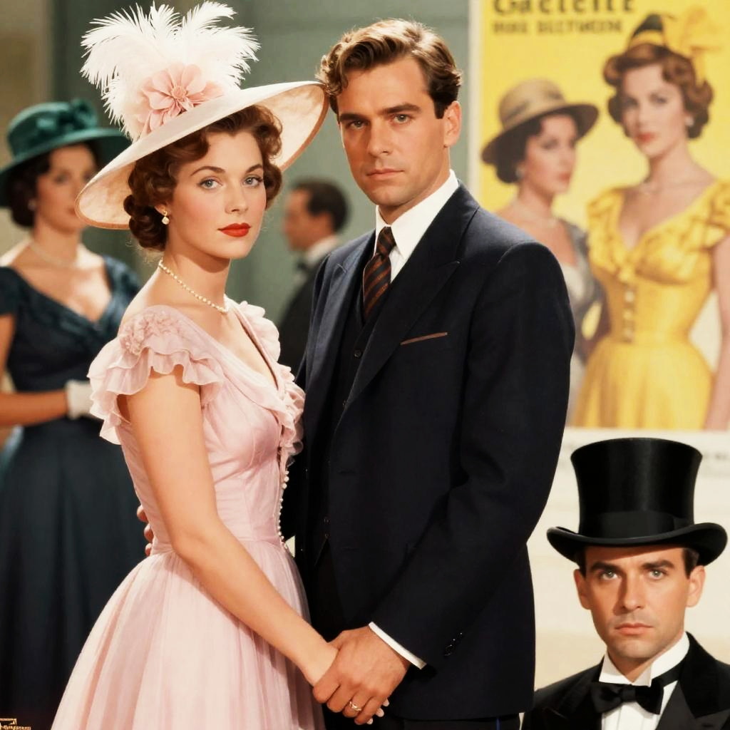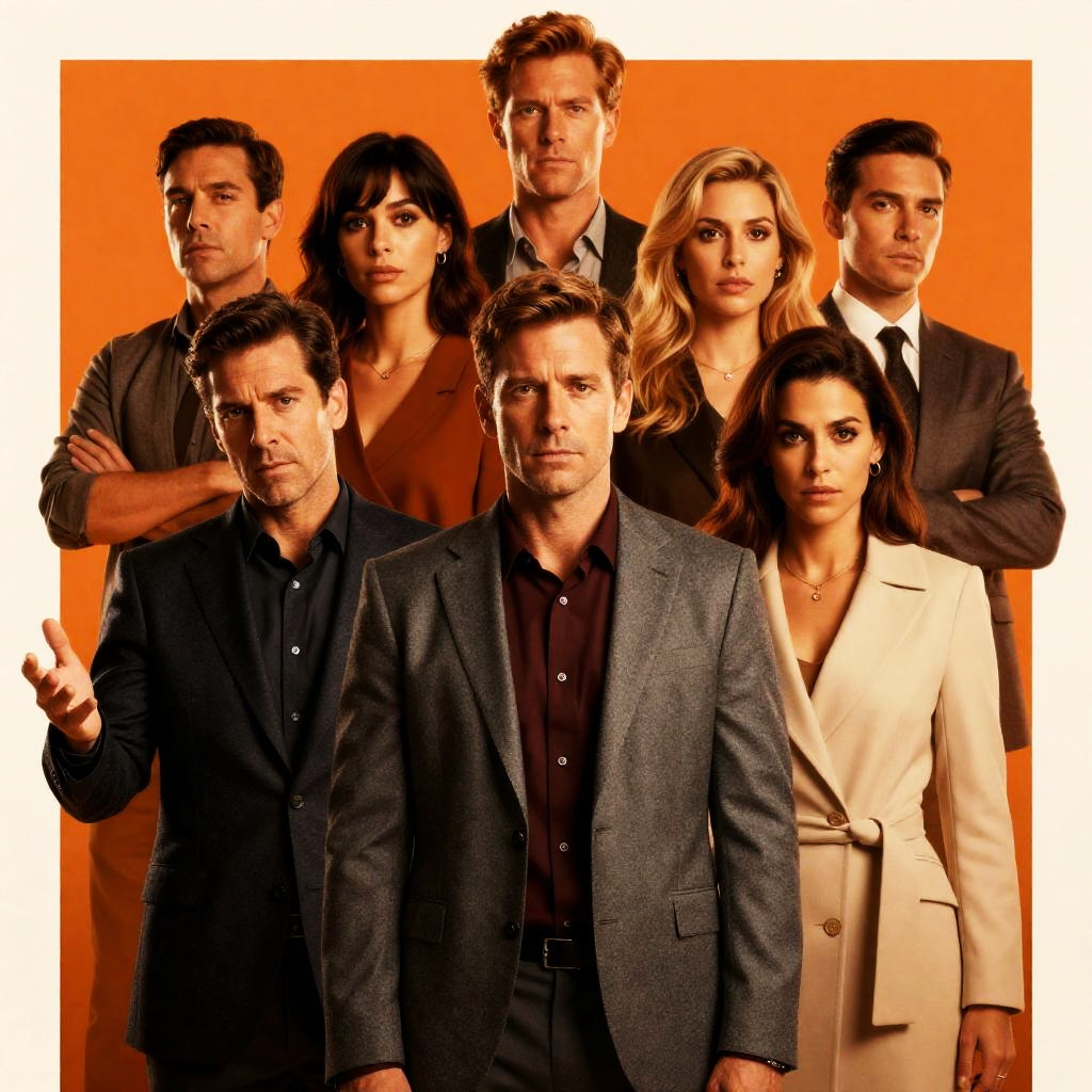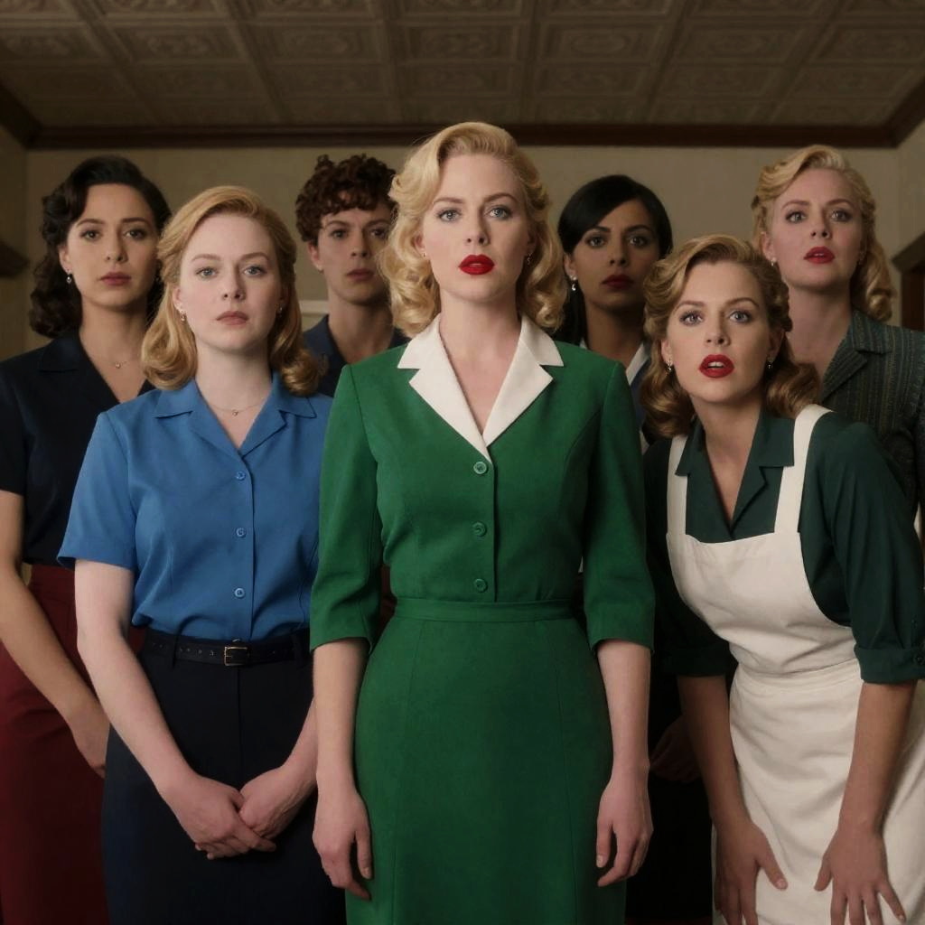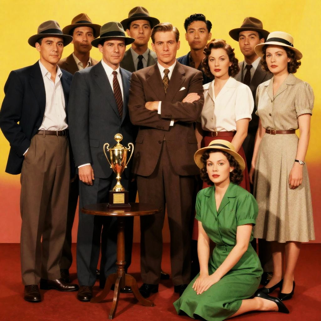 A vintage-style movie poster featuring four actors against an orange background. Centered is a woman with curly brown hair wearing a green dress and pearl necklace, smiling brightly. To the right is a blonde woman in a black dress and pearl necklace, also smiling. At the top right, a man with short blonde hair has a serious expression, dressed in a dark suit and tie. At the bottom left is a man with glasses, wearing a white coat and striped tie, smiling. The poster evokes a classic mid-20th century aesthetic with bright, even lighting.