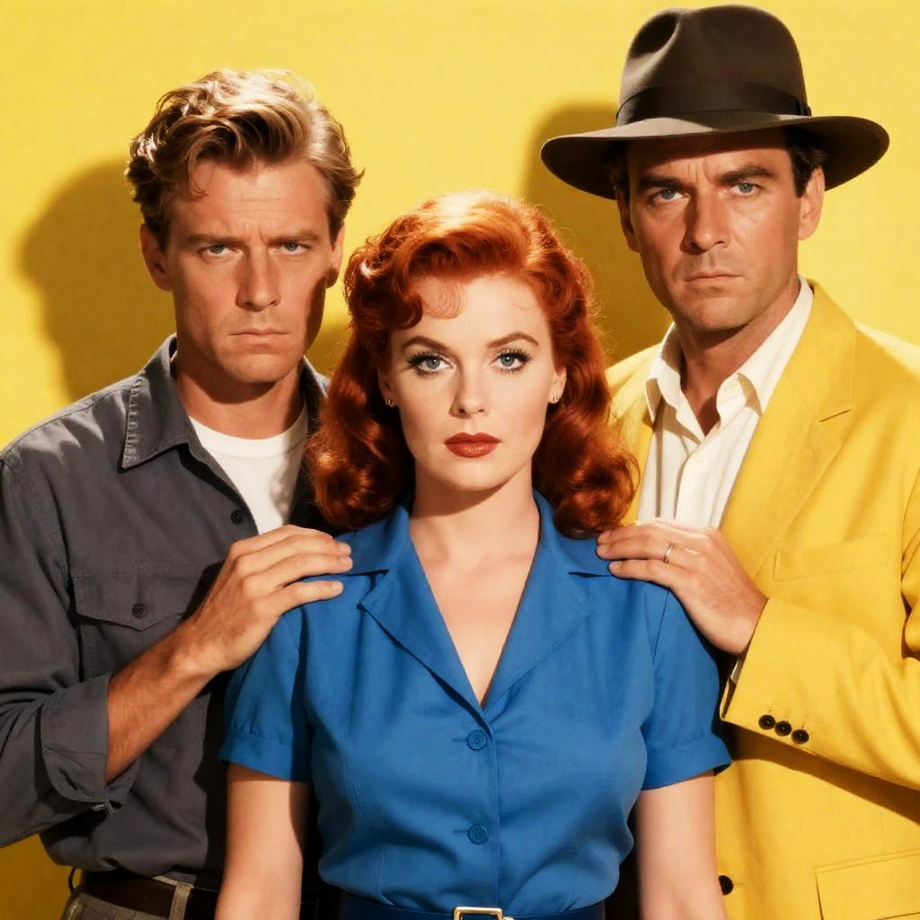 Movie poster of "Three Men in White" with four actors. Center: woman with curly brown hair, green dress, smiling. Right: blonde woman in black dress, smiling. Top right: man with short blonde hair, serious expression. Bottom left: man with glasses, white coat, smiling. Orange background. Bright lighting. Vintage style.