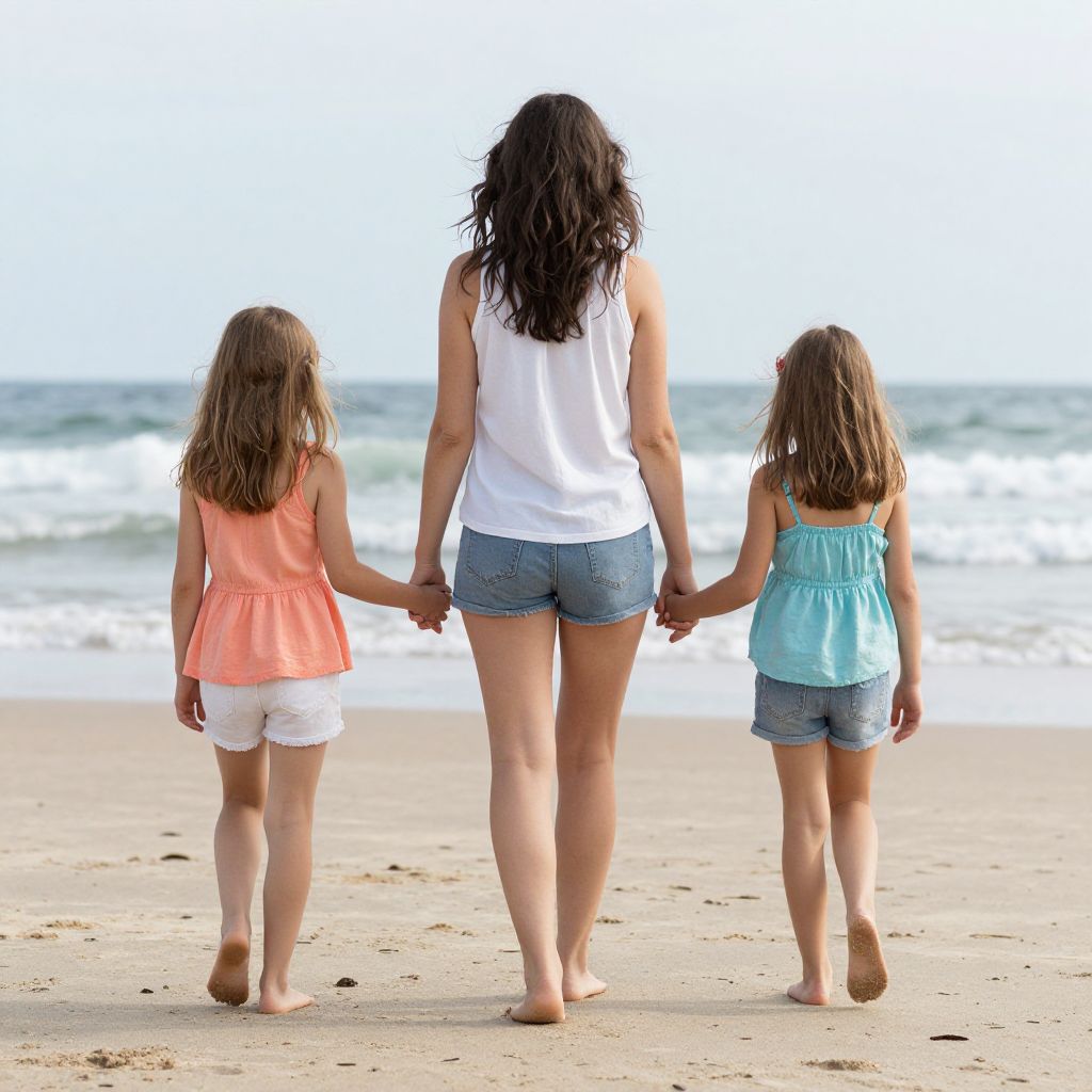 Photograph of a woman in a white tank top and denim shorts holding hands with two young girls, walking barefoot on a sunny beach.