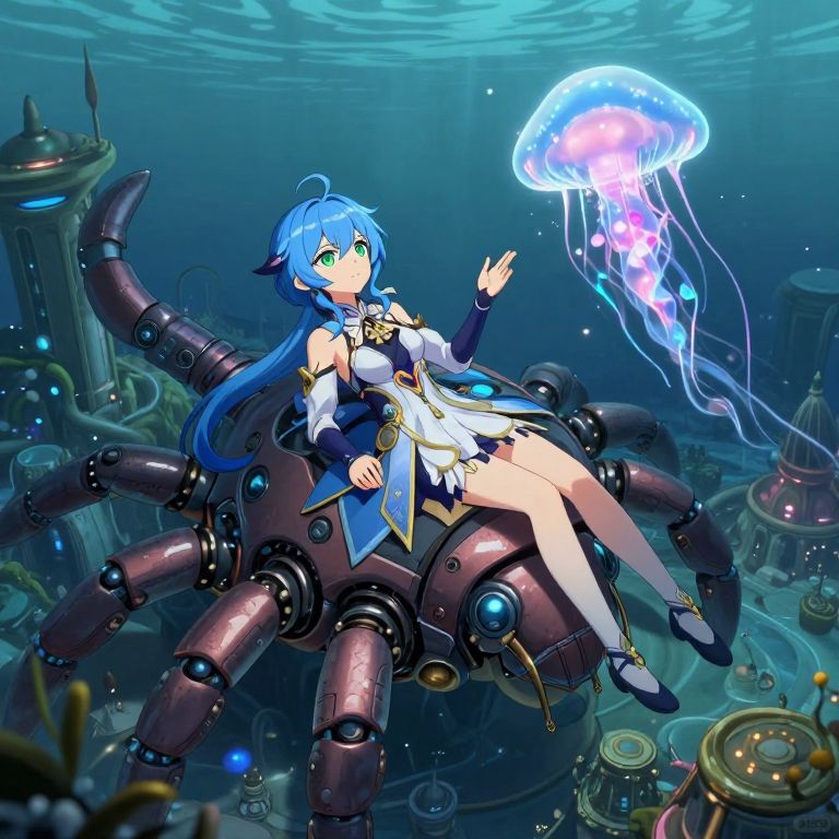 Digital anime artwork of a blue-haired girl in a white and blue outfit, floating underwater, surrounded by mechanical tentacles, with a glowing jellyfish nearby