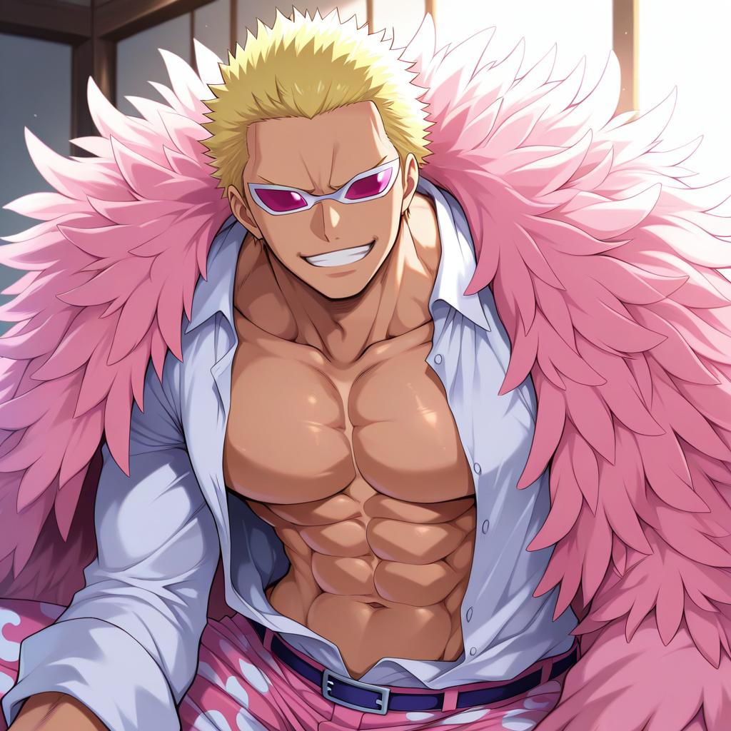 Digital illustration of Donquixote Doflamingo, a muscular male anime character from One Piece, featuring blonde short hair, white-framed pink sunglasses, a pink feather coat, and an open white shirt revealing defined abs. The character sports earrings and a confident smile, rendered in a vibrant anime style.