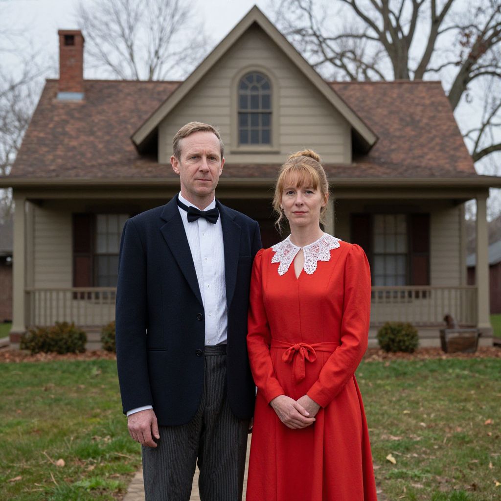 Classicly dressed couple standing in front of a traditional American house, reminiscent of Grant Wood's \"American Gothic,\" with the man in a formal suit and bow tie, and the woman in a vibrant red dress with lace collar, set against a serene suburban backdrop featuring a chimney, arched window, and bare trees.