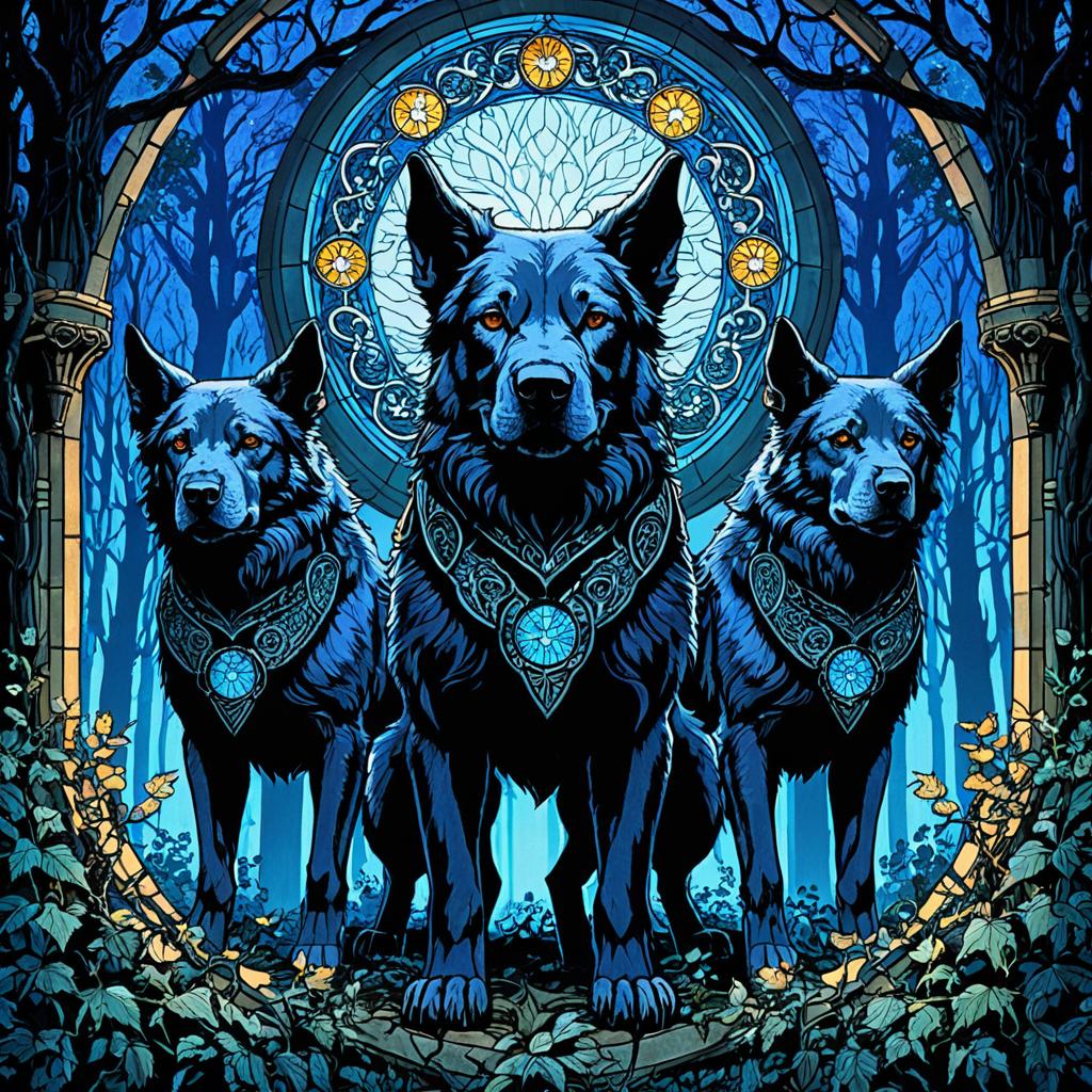 Symmetry!! portrait of a cerberus made of ancient brambles and stained glass set against an ethereal blue twilight forest, featuring intricate metallic filigree and luminous circuitry, digital painting, concept art, ArtStation quality, smooth, sharp focus, illustration by Hayao Miyazaki, Moebius, Yoshitaka Amano, 8K.