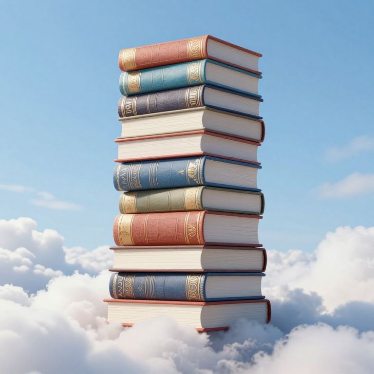 A surreal 3D-rendered scene depicts a towering stack of books precariously balanced atop fluffy white clouds, with each book's spine showcasing intricate details and varying textures, evoking a dreamlike, high-definition visual effect against a clear blue sky.