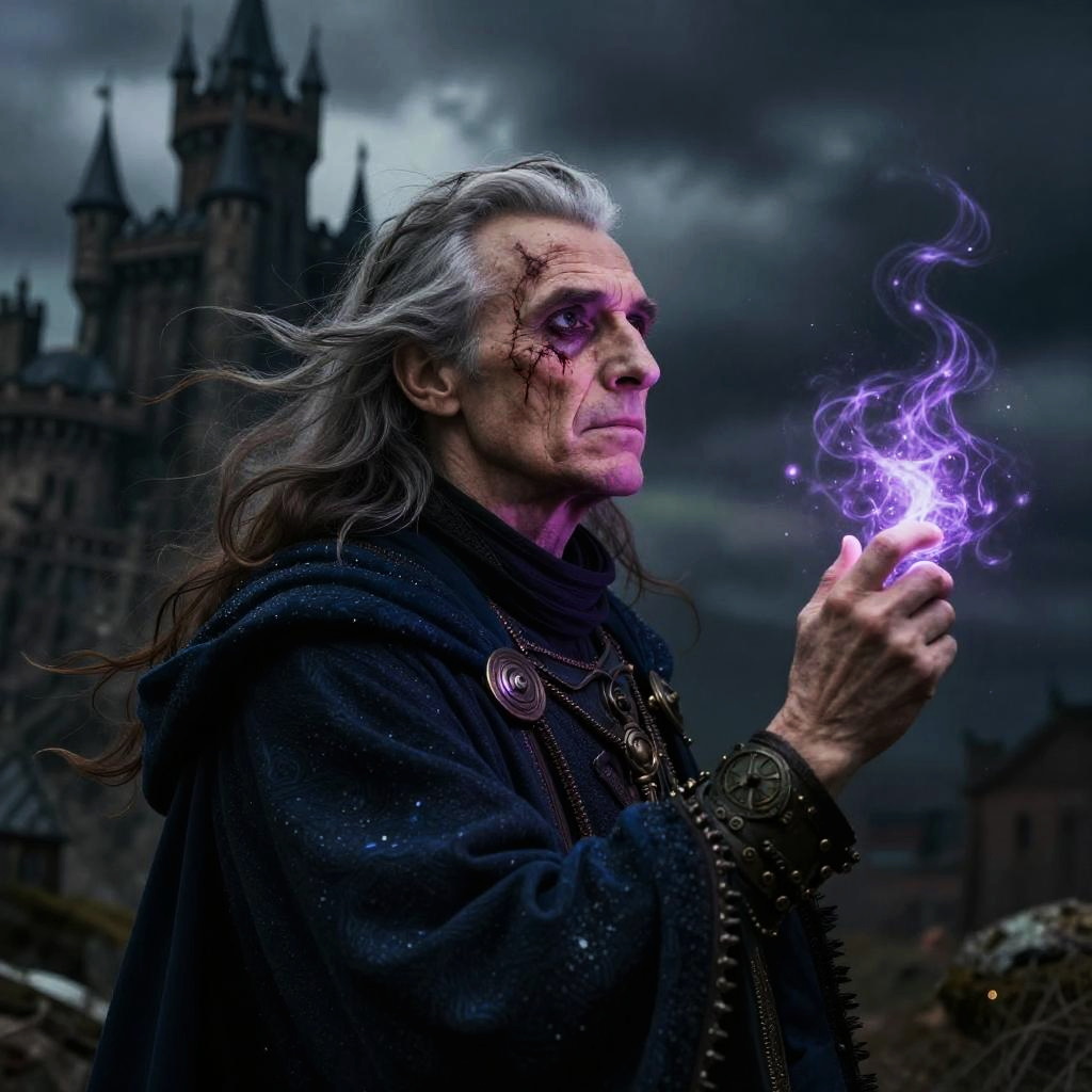 Photograph-like digital art depicting an elderly man with long, gray hair, wearing a dark, ornate cloak with intricate metal buckles. His pale skin is scarred, and he holds a glowing, purple, magical flame in his right hand. The background features a gothic, medieval castle under a stormy, dark sky. His intense, focused expression contrasts with the ominous atmosphere. The image emphasizes a fantasy, magical theme with high contrast and dramatic lighting.