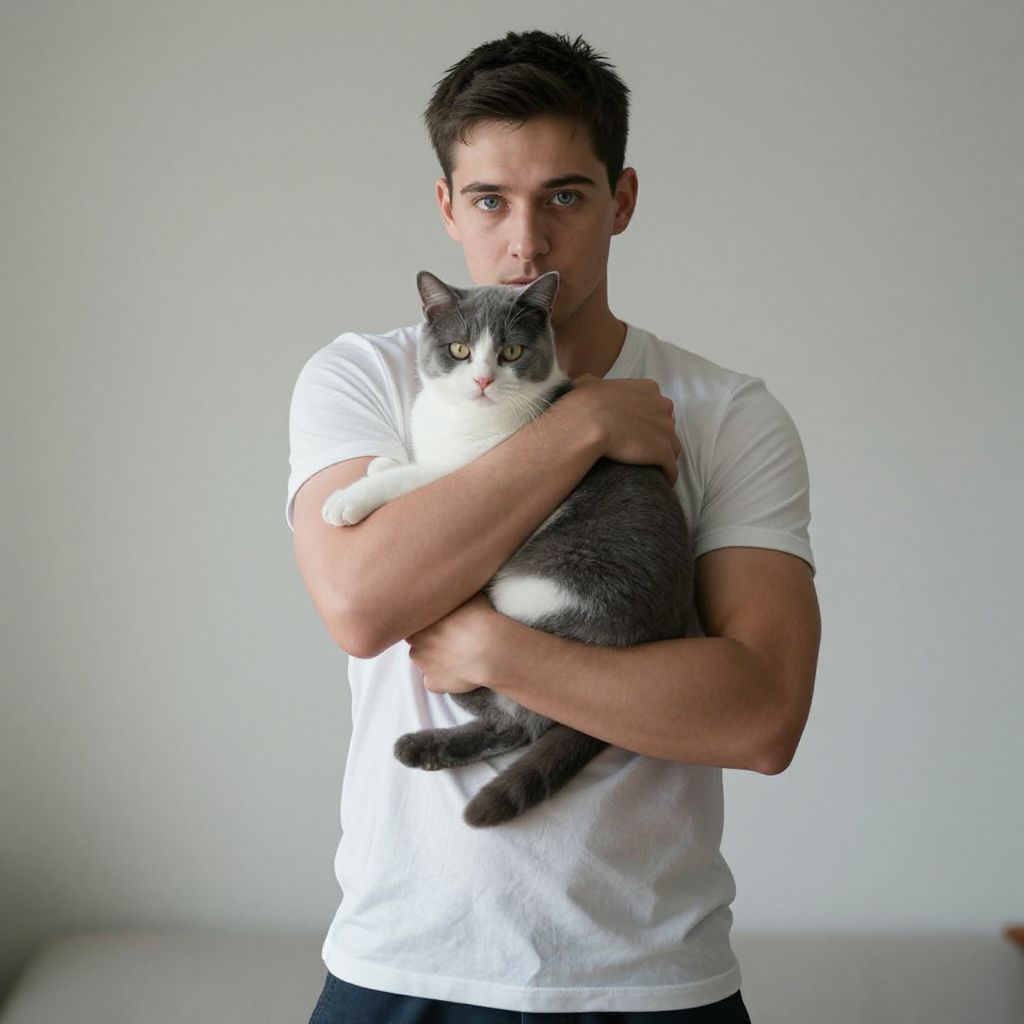 Full body shot of a man, strong presence, holding a gray and white cat, both standing confidently, modern minimalist setting, soft natural light, highlights their features, neutral background, clean lines, simplicity, serenity, calm atmosphere, gentle interaction between the subject and animal, emotional connection, deep gaze. Man has masculine face and piercing eyes