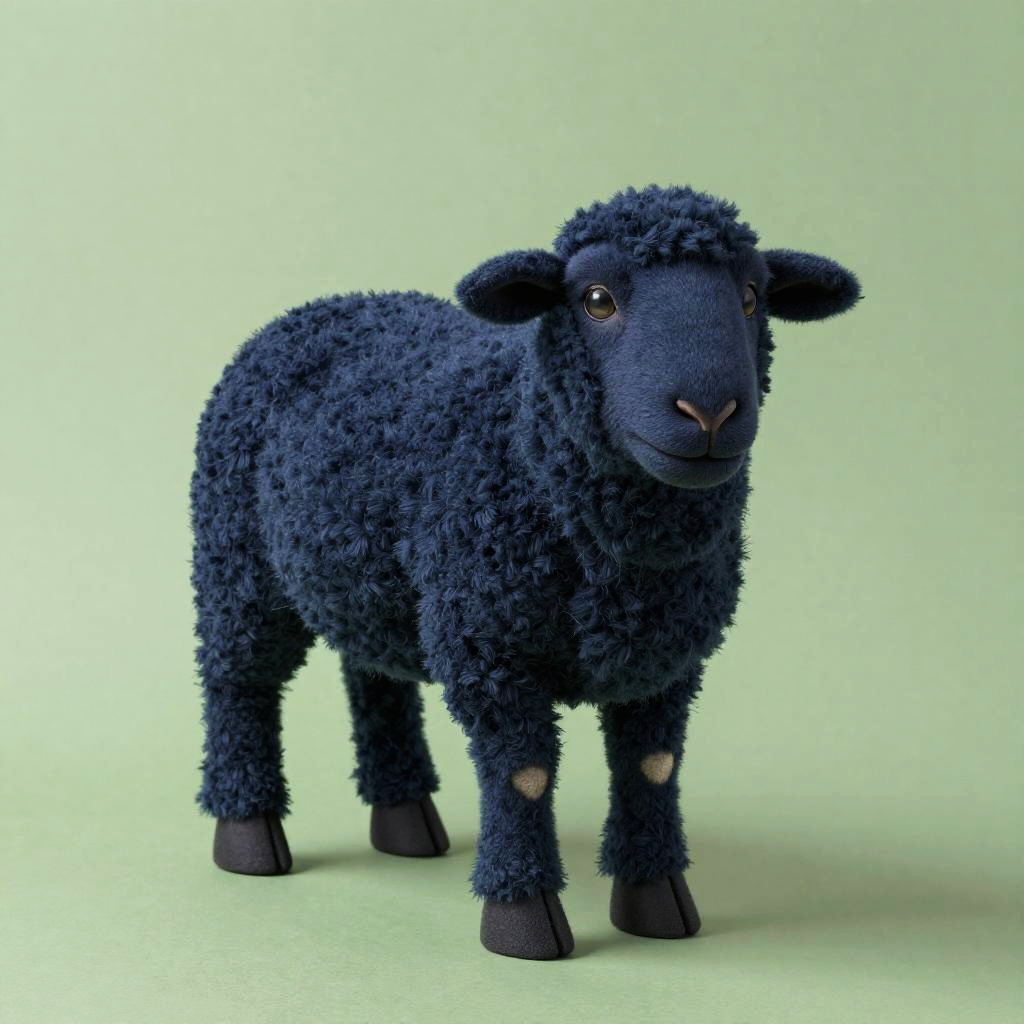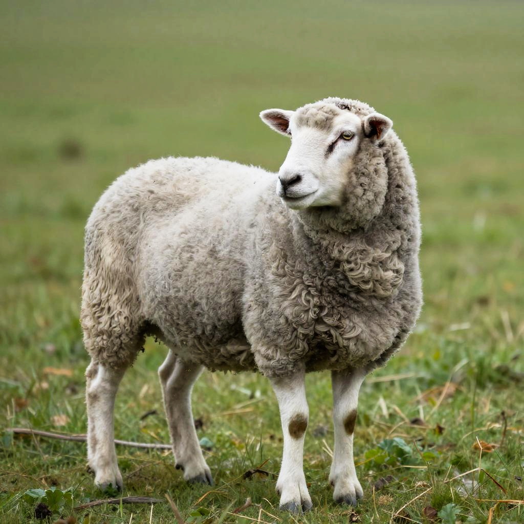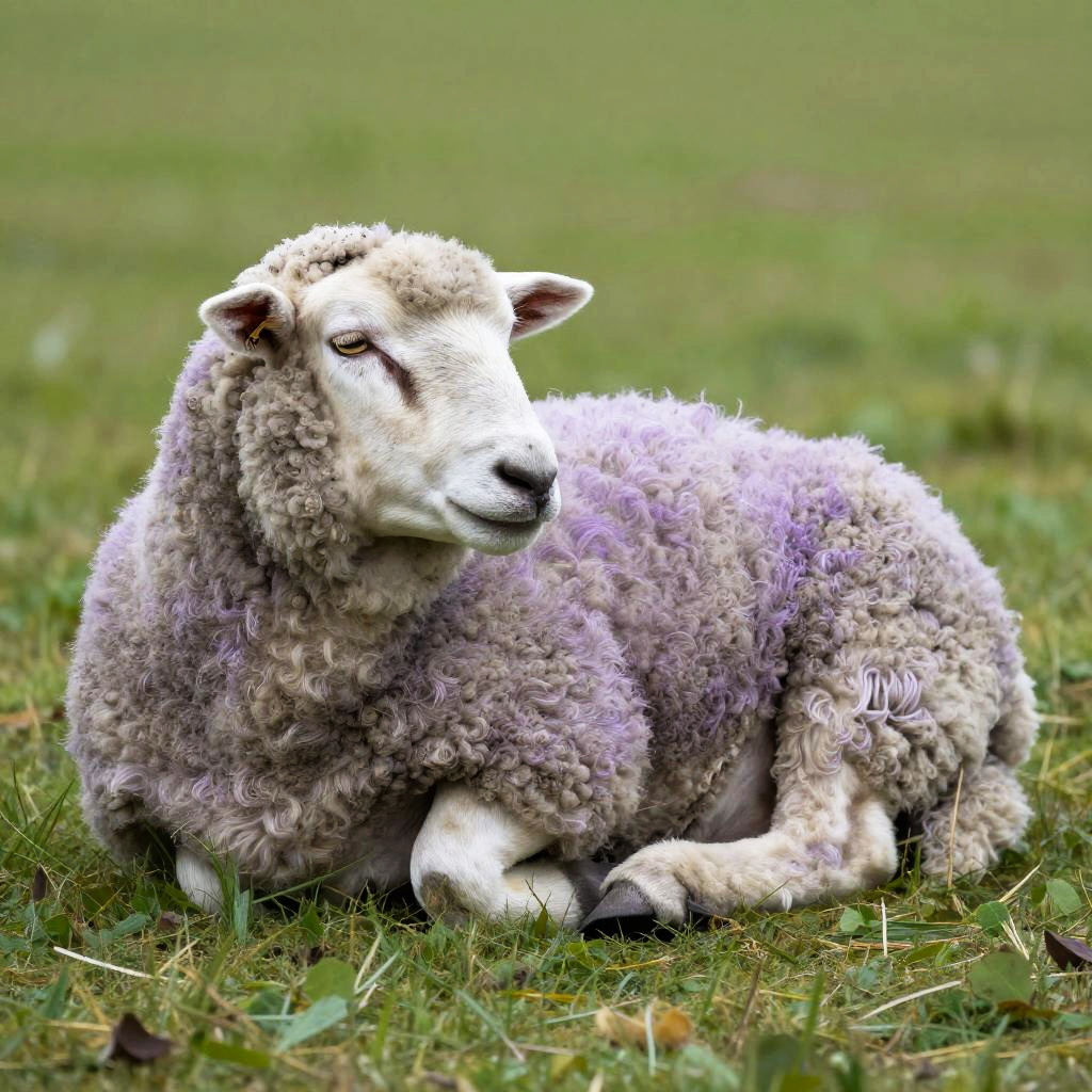 Full body, solo, sheep, dense silver curly fleece with gentle blue eyes, realistic furry texture, closed mouth expression, lounging, green background